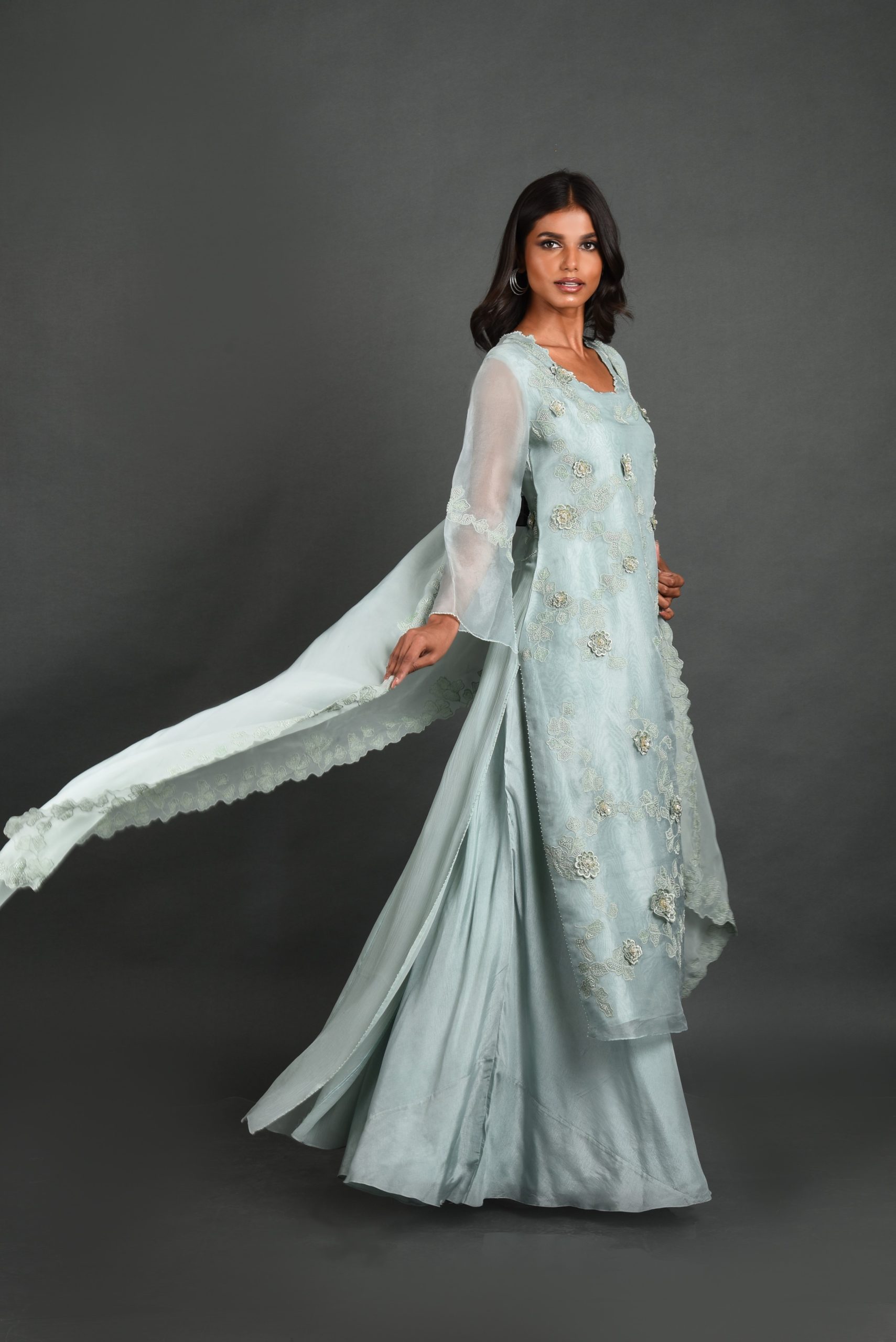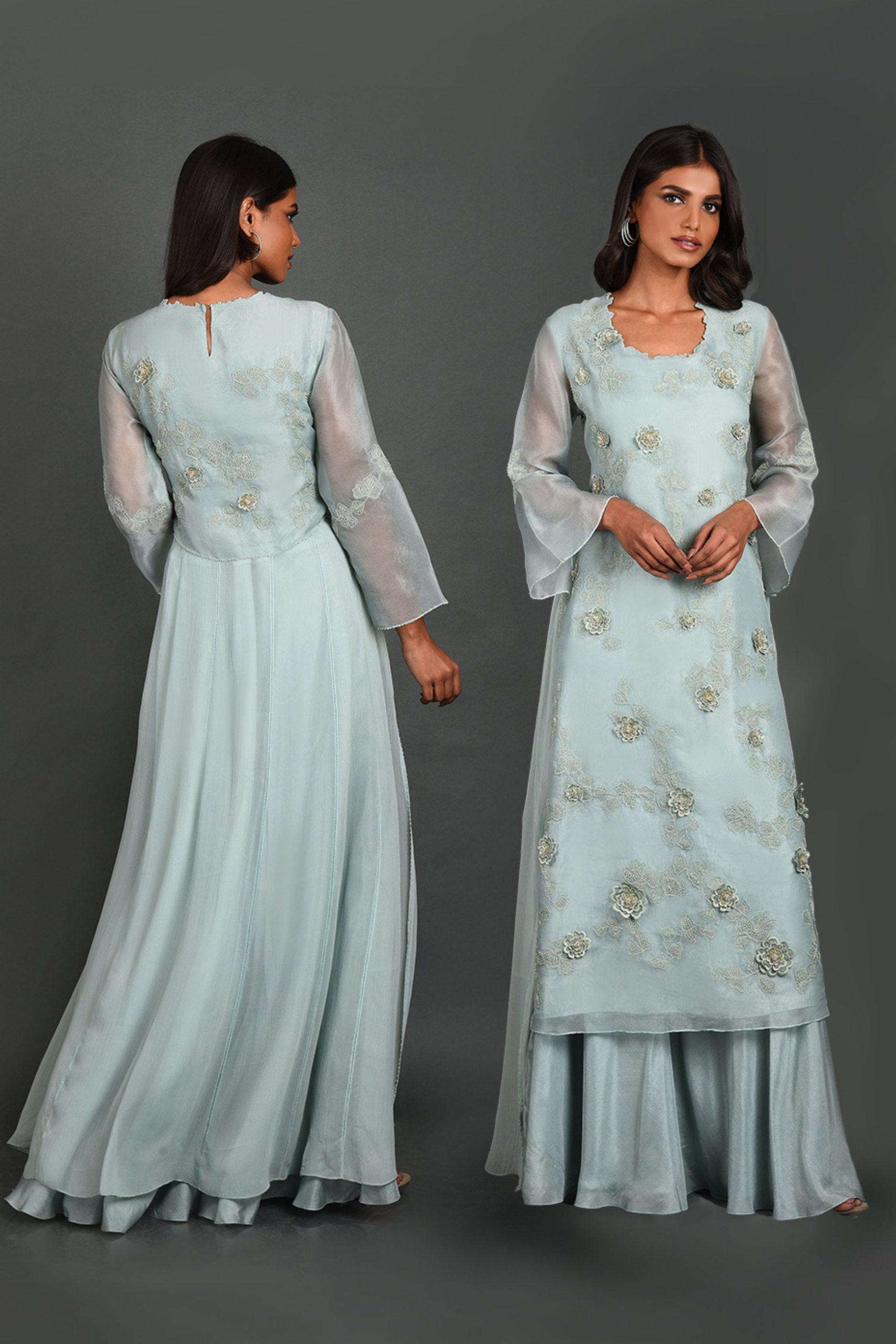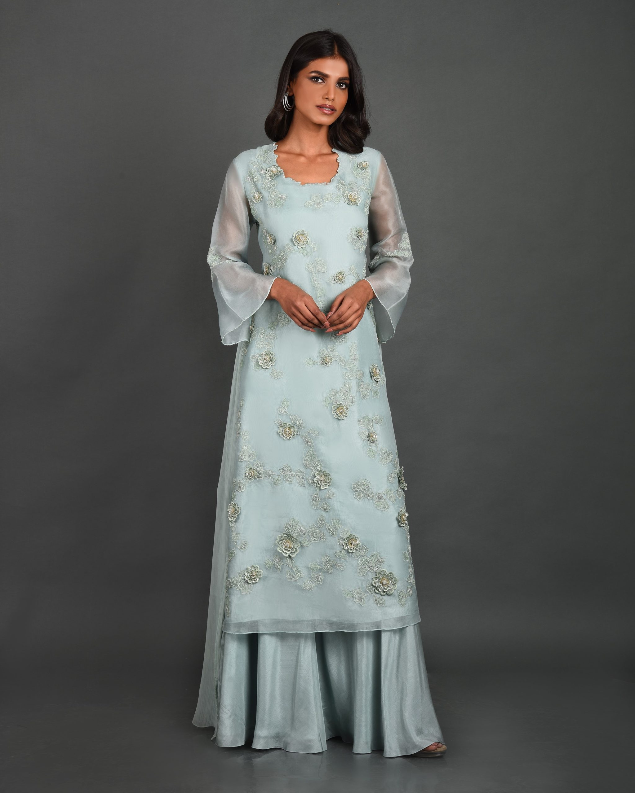 Embrace ethereal elegance with the Elysian Blue Organza Kurta Set from House of Ksara’s “Dancing Daises” collection. Featuring intricate thread and bead work, a Back Kali silhouette, and a half dupatta, this ensemble is perfect for formal dinners and milestone celebrations. Handcrafted for timeless charm and modern sophistication.