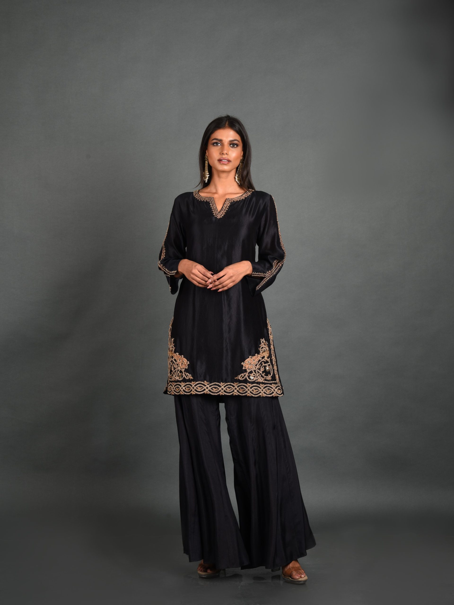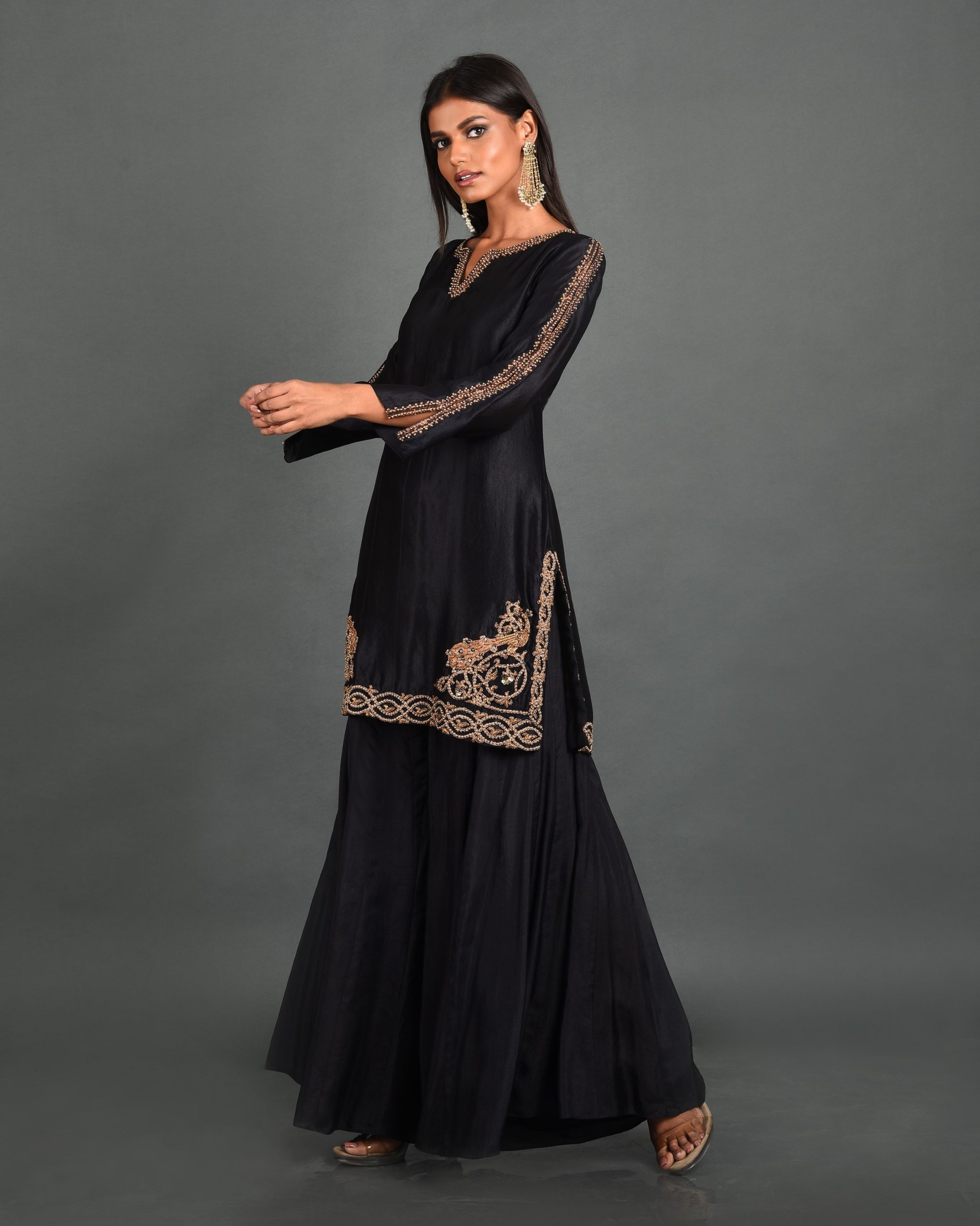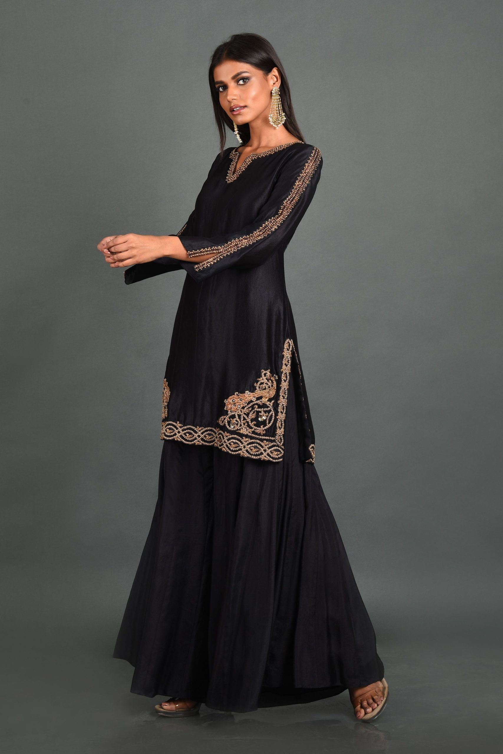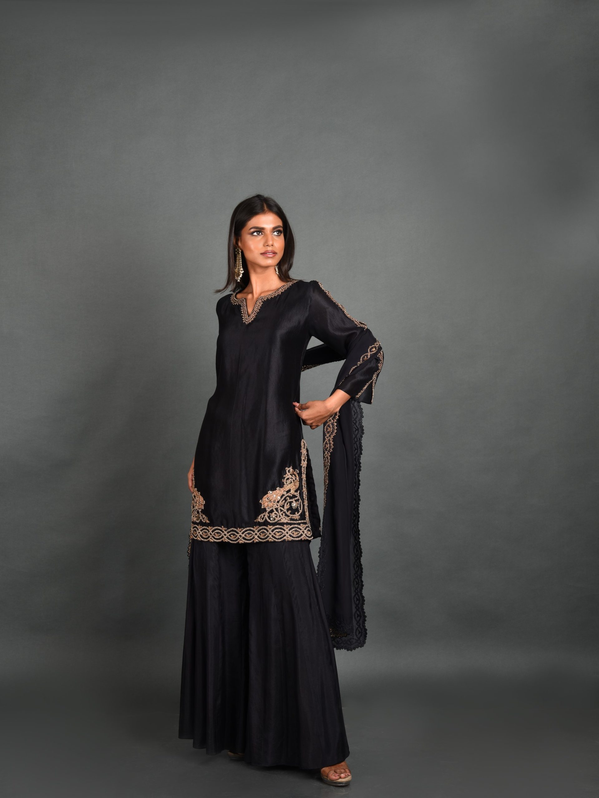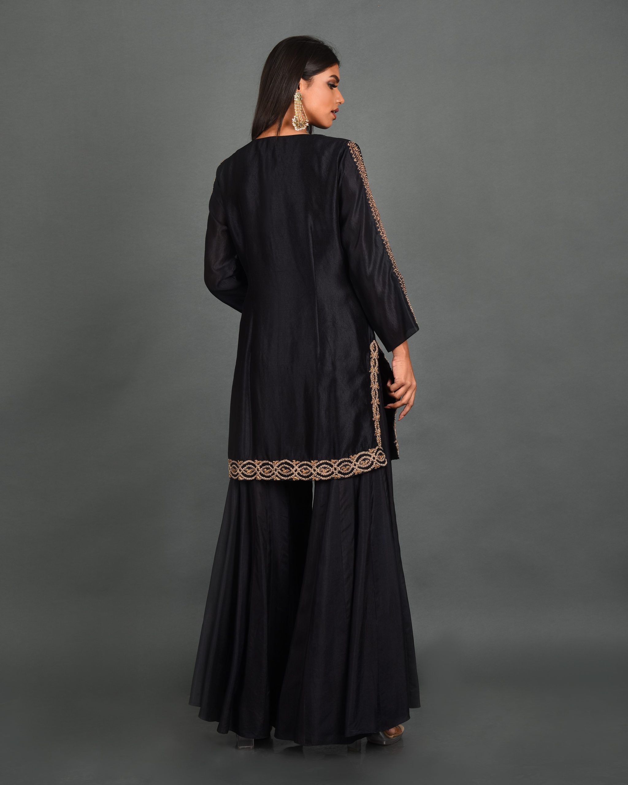Discover timeless elegance with our Midnight Elegance Kurta from House of Ksara’s “Own Your Strut” collection. Crafted from Summer Silk – Kora Dupion, this black A-line kurta features delicate Dori work and shimmering cutdana embellishments inspired by the peacock’s beauty. Perfect for special occasions, embrace your unique journey with grace and confidence in this meticulously handcrafted piece.
