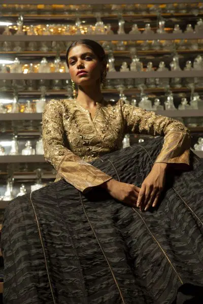 Embrace the ethereal glow of dawn with the Dawn Radiance Kalidar Lehenga from House of Ksara’s “Strands of Sunshine” collection. Handcrafted from summer silk – Kora Dupion, this black lehenga features intricate thread and beadwork, perfect for weddings and special celebrations. Experience timeless elegance and sustainable luxury with every graceful fold and shimmer.