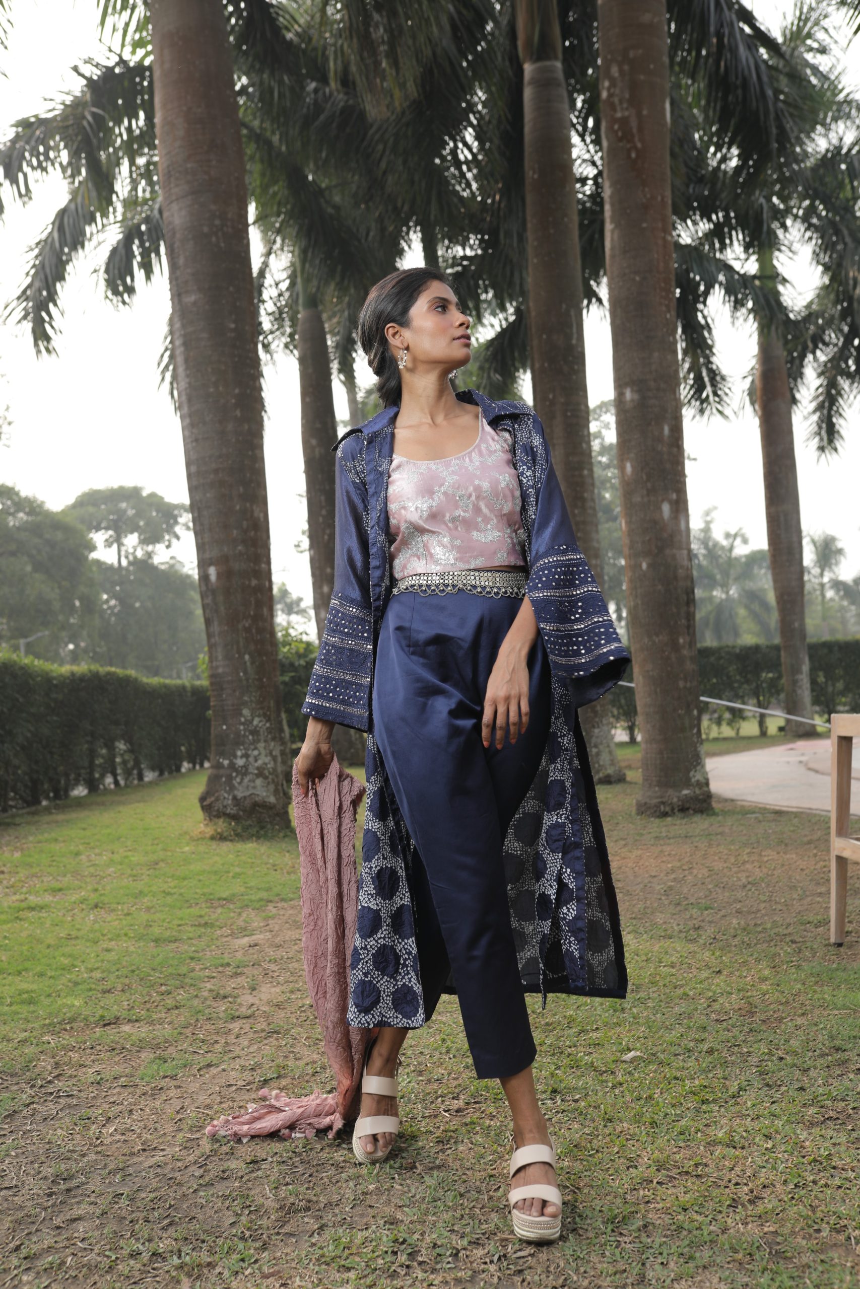 Indulge in sophistication with our Twilight Elegance Bandhej Jacket, Kurta, and Pant Set, designed to elevate your evening attire. Featuring a front open long jacket with delicate sequin work, bell sleeves, and a collar neckline, this ensemble exudes timeless charm. Crafted from luxurious Bandhej fabric in a captivating blue hue, it’s the perfect choice for any evening get-together, ensuring you stand out with effortless elegance.