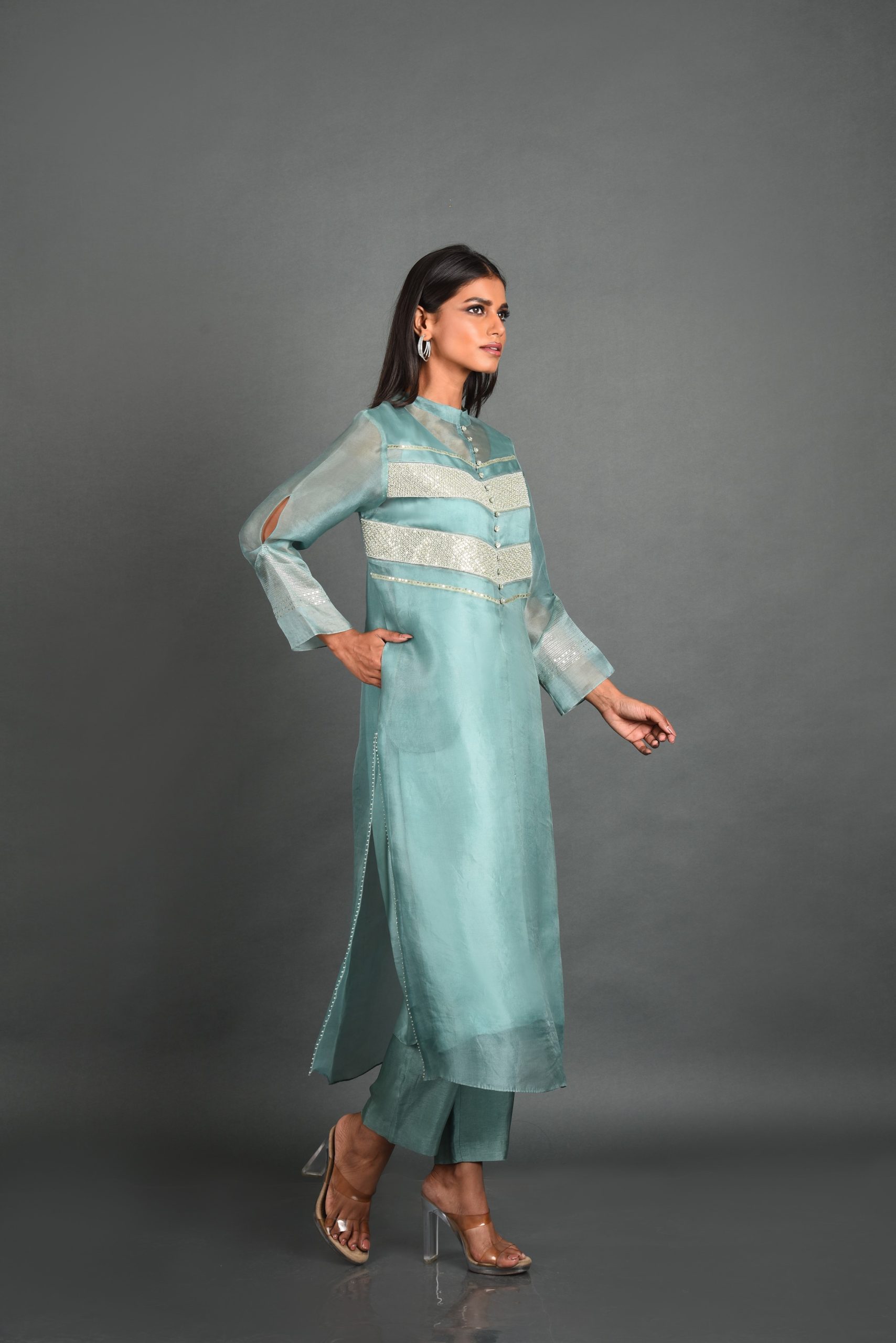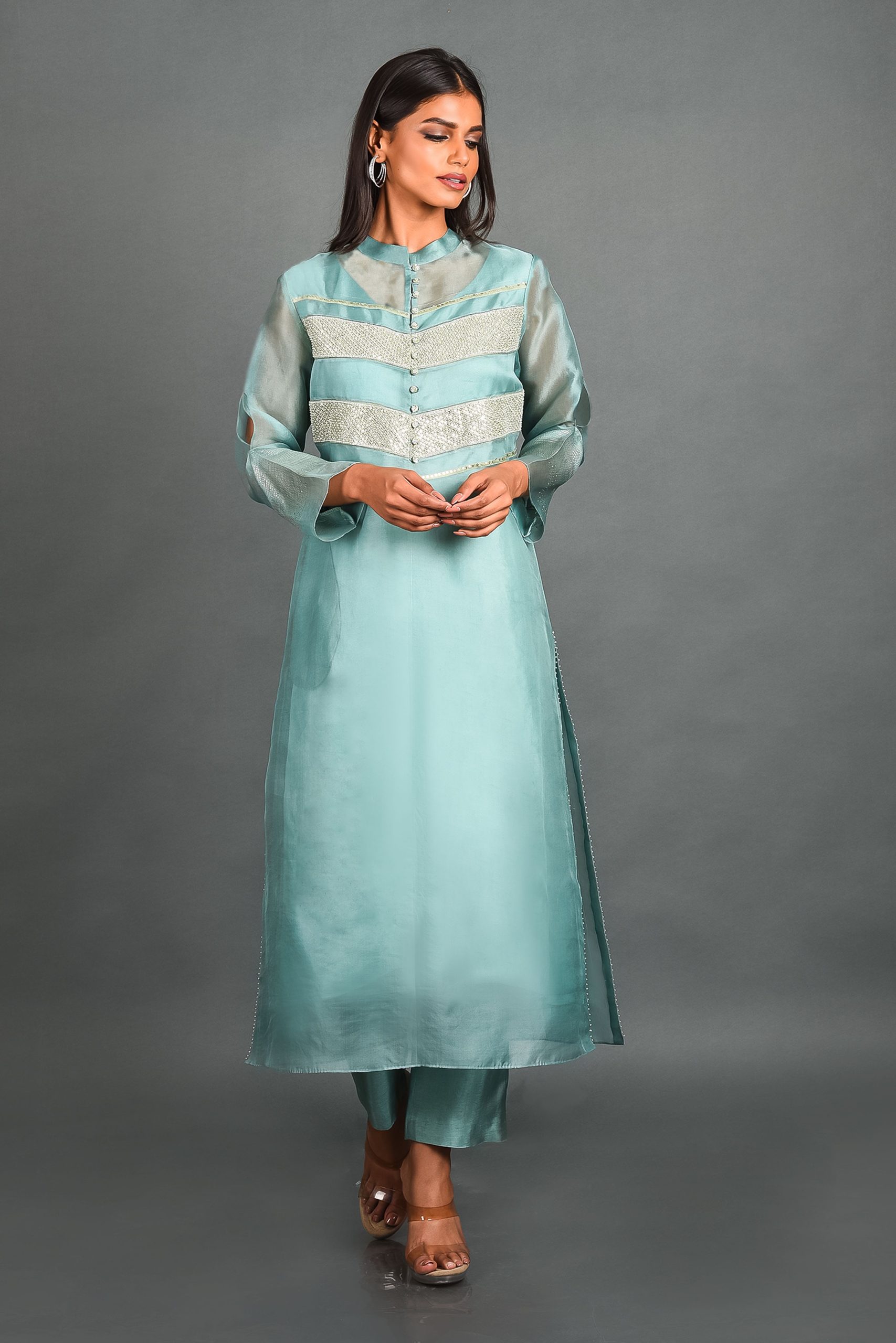 Embrace the serenity of dawn with the “Dawn’s Embrace Sequin Organza Kurta” from House of Ksara. Crafted from luxurious silk organza in a serene blue hue, adorned with delicate sequin work, this A-line kurta features a Mandarin collar and 3/4 pinched sleeves. Perfect for gatherings, Puja’s, and Rakhi lunches, it blends traditional elegance with modern sophistication, allowing you to radiate confidence and grace.