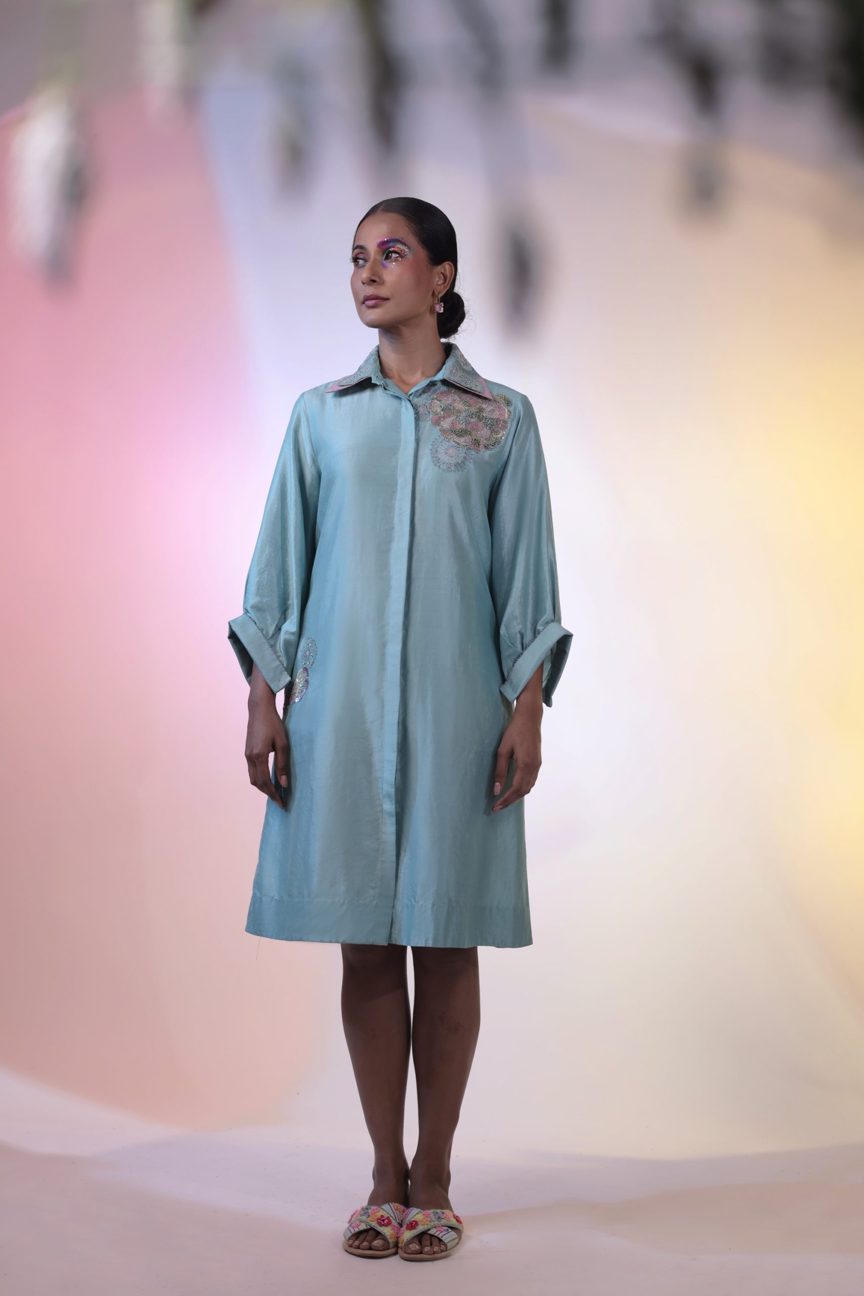 Discover the effortless elegance of the Serene Meadow A-Line Dress from House of kSara’s “Meadow’s Song” collection. Crafted from thick silk, this dress features a flattering A-line silhouette, front placket, 3/4 inverted cuff sleeves, and a double collar. Adorned with intricate thread bead work, it captures the serene beauty of nature. Perfect for afternoon soirees, formal events, and Rakhi lunches, this dress evokes pure joy and self-assurance.