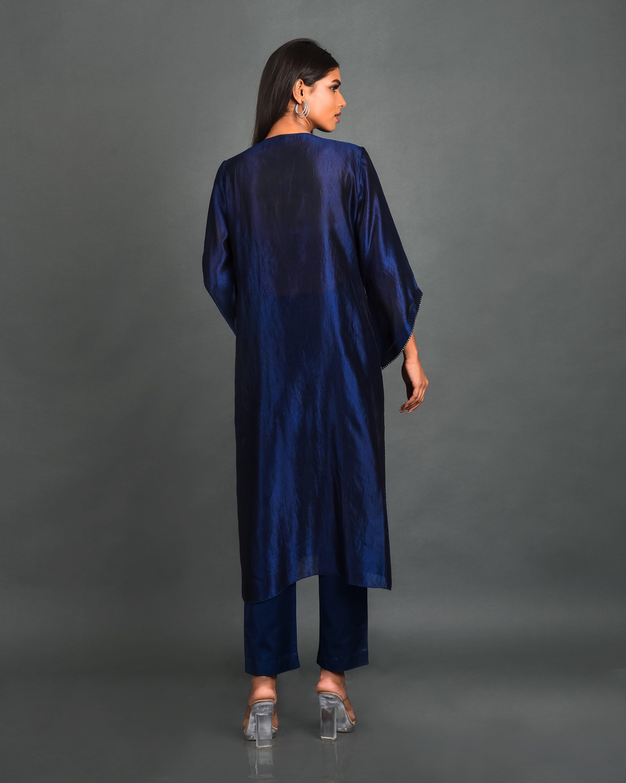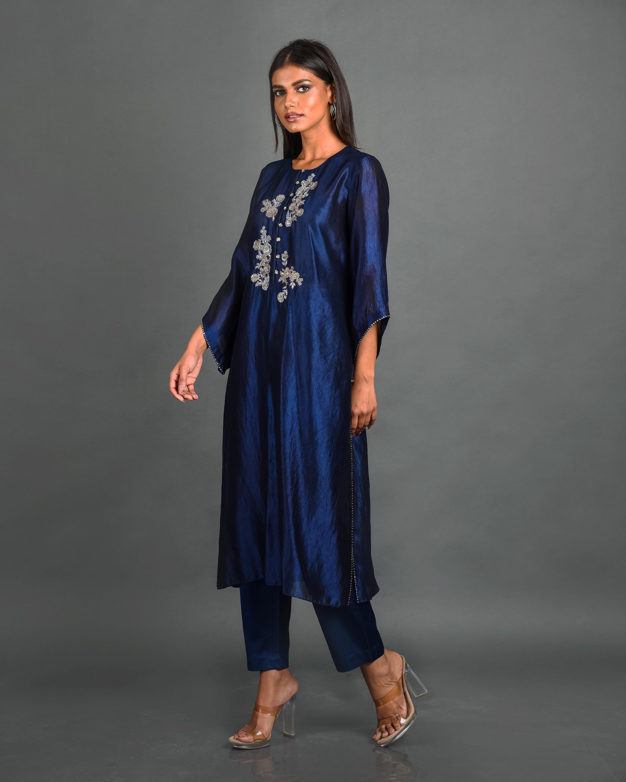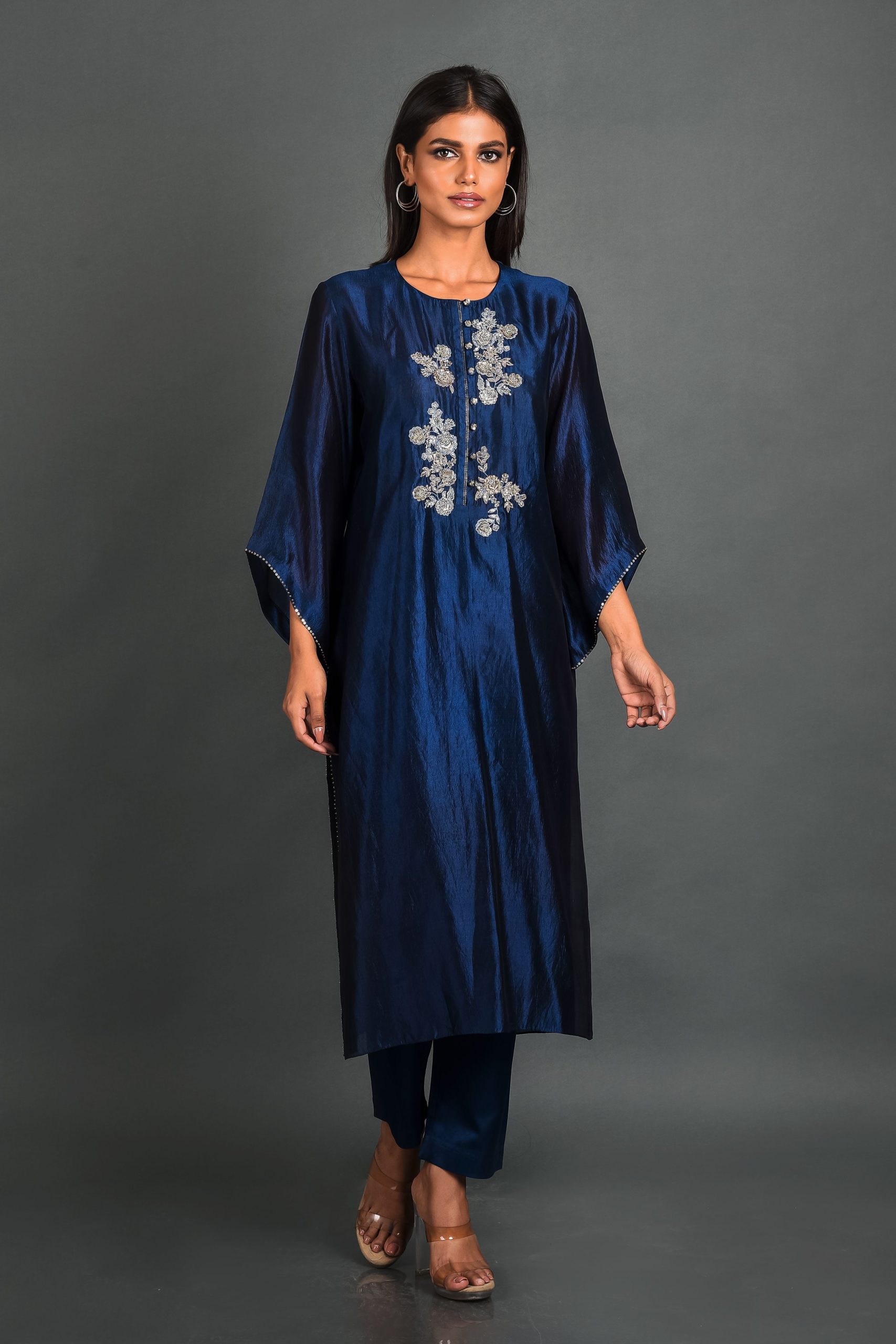 Experience elegance redefined with our Azure Dew A-Line Summer Silk Kurta from the “Shimmering Shrubs” collection by House of Ksara. Handcrafted from luxurious blue summer silk – kora dupion, adorned with intricate thread beadwork, it features a flattering A-line silhouette, 3/4 flared sleeves, and a round open neckline. Perfect for mehendi parties, pujas, or dinners, this kurta embodies timeless grace and contemporary style.