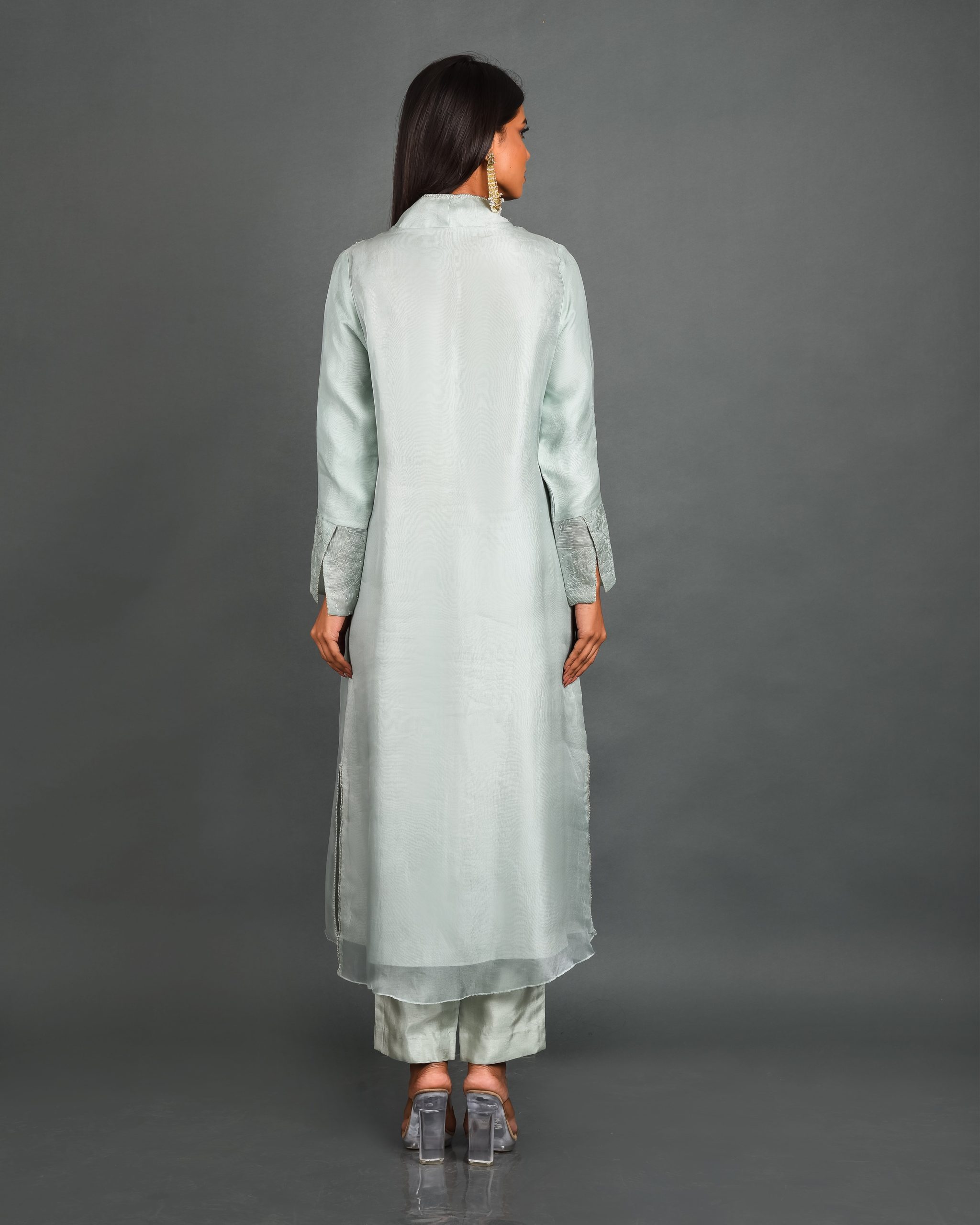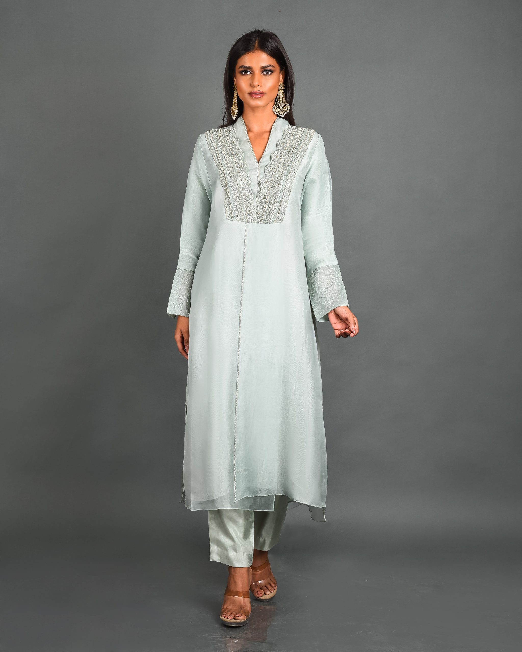 Elevate your occasion wear with the Ethereal Dewdrop Kurta from House of Ksara’s “Shimmering Shrubs” collection. This grey organza kurta features a V-neck, yoke overlap, and exquisite thread beadwork, making it the perfect choice for Haldi functions, pujas, and engagement parties. Handcrafted elegance and timeless charm define this luxurious piece.
