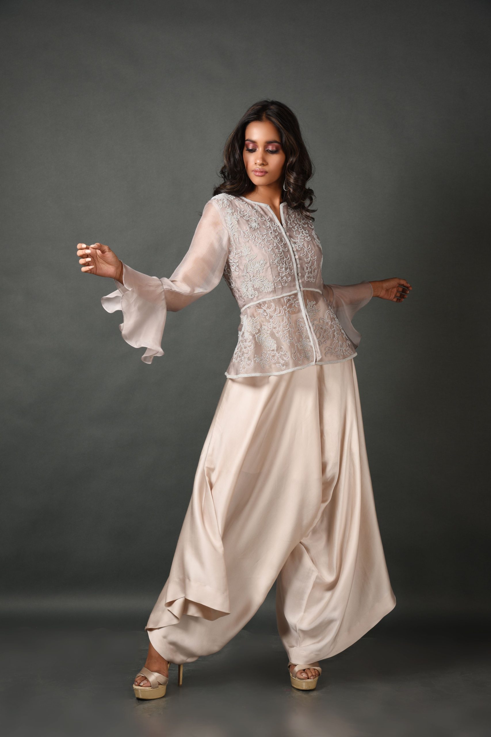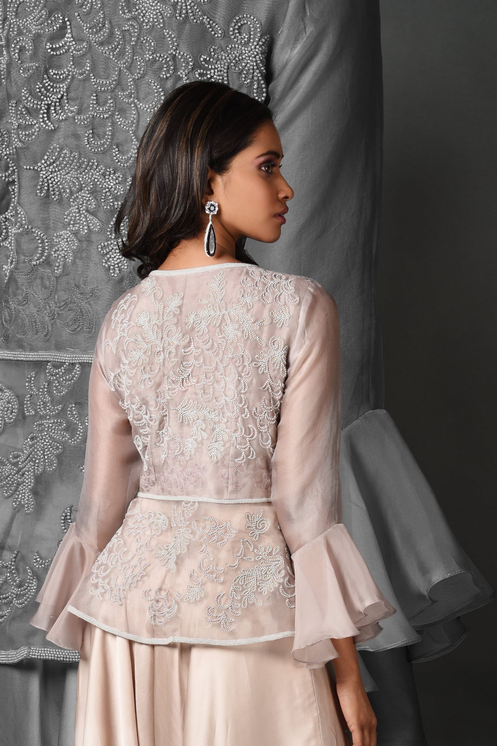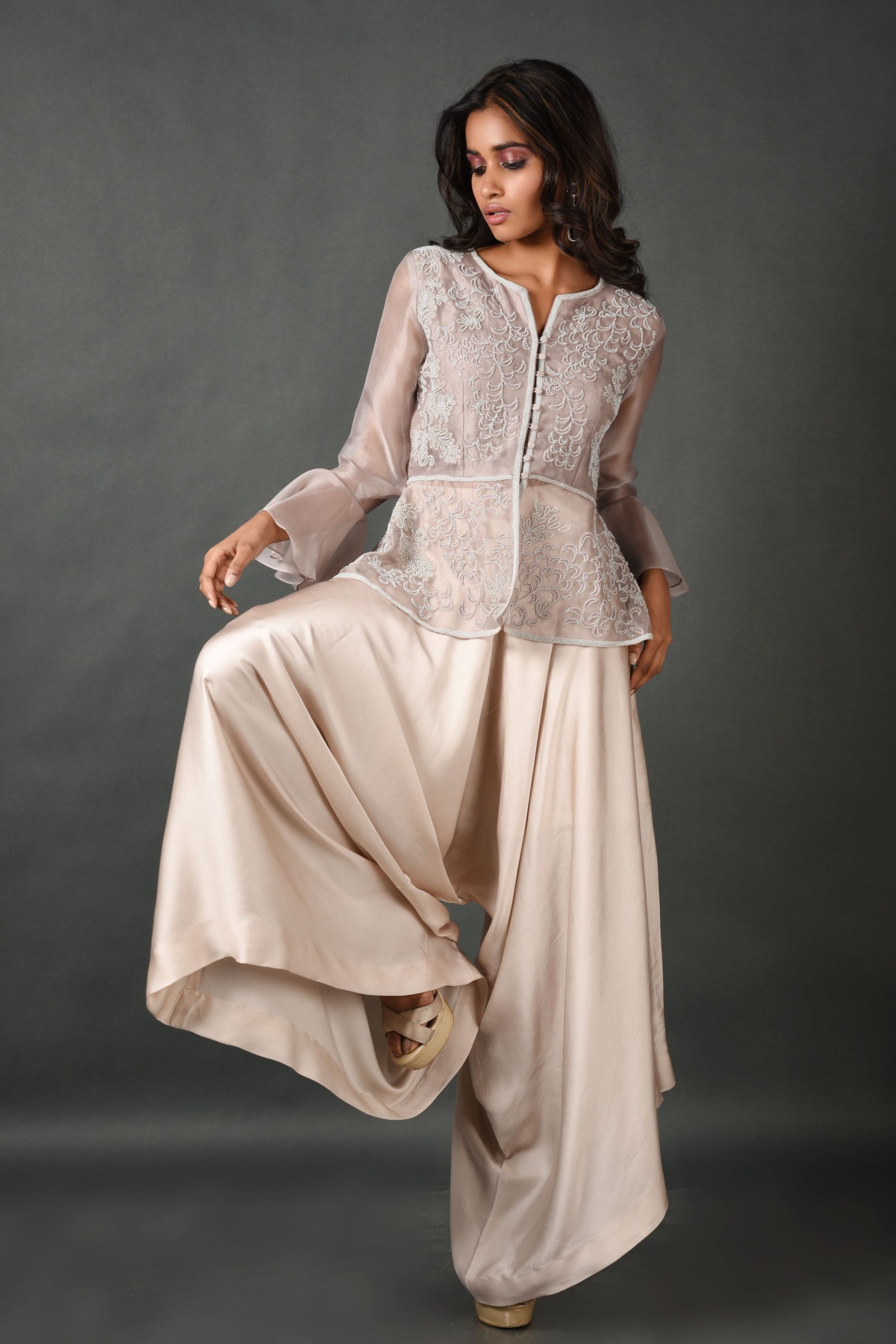 Embrace elegance with the Peacock Grace Peplum Satin Top by House of Ksara. Featuring exquisite thread and moti work on grey satin, this peplum top with 3/4 circular flounce sleeves is perfect for gatherings, cocktail parties, and milestone celebrations. Handcrafted to perfection, it combines traditional craftsmanship with modern sophistication.