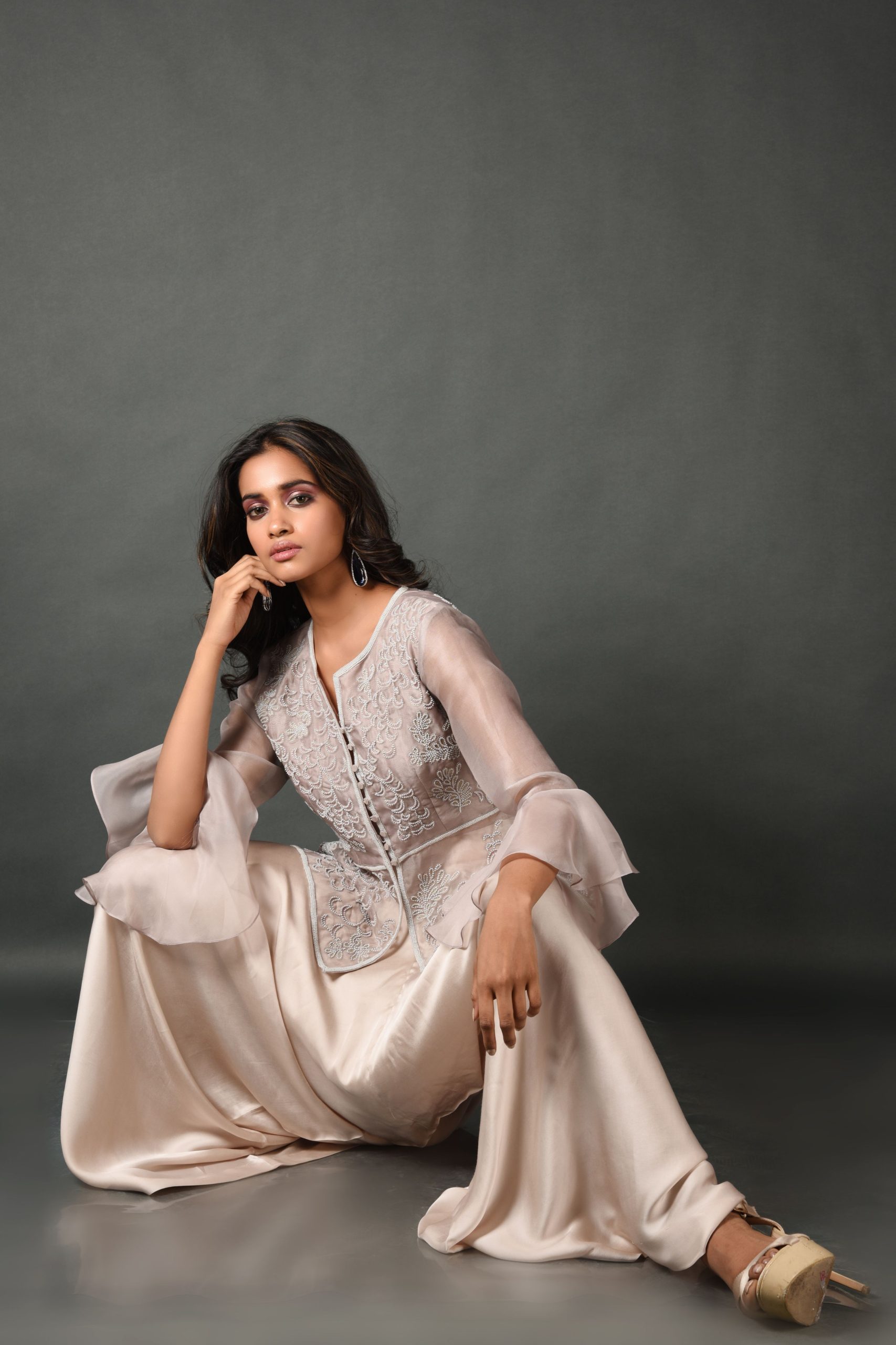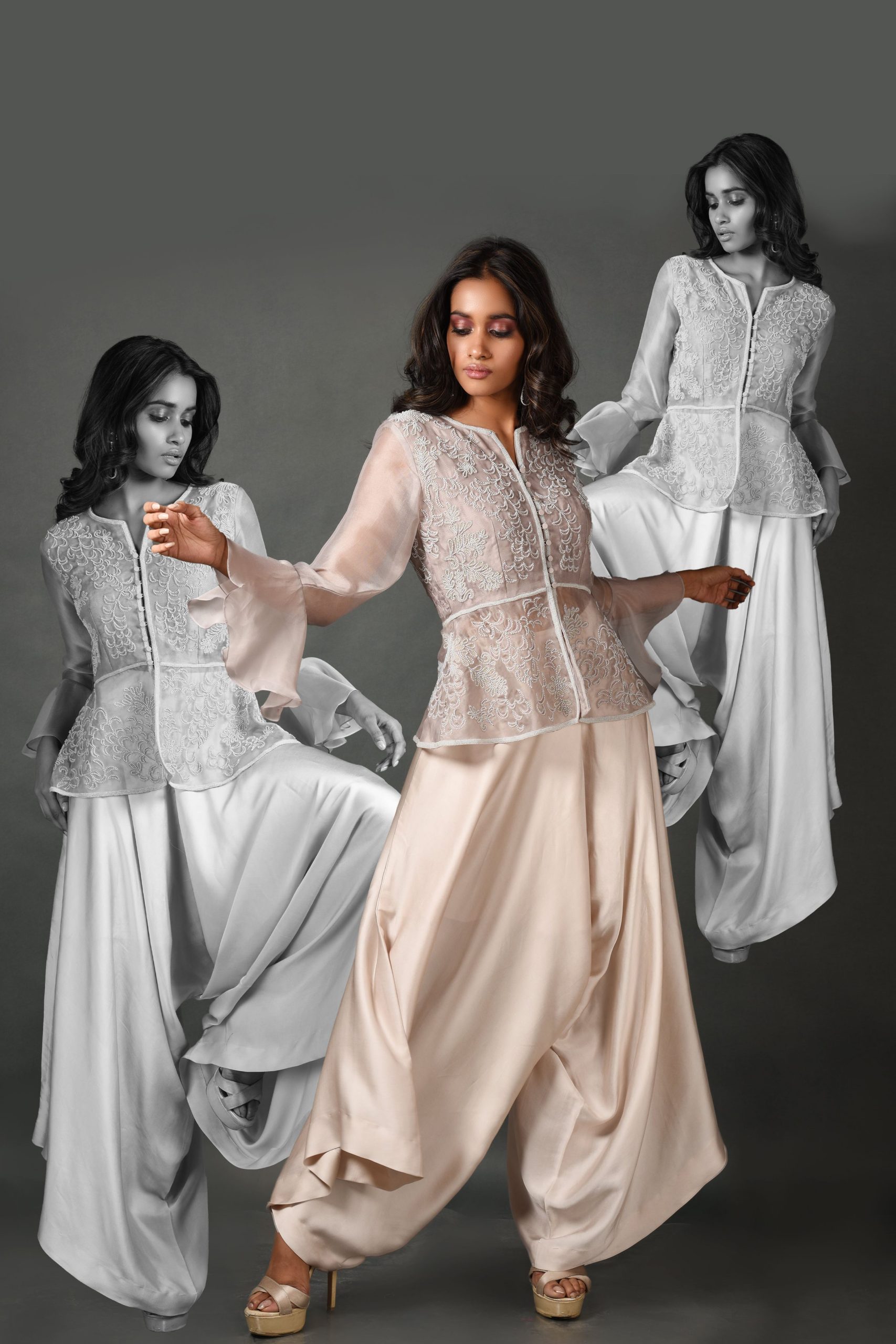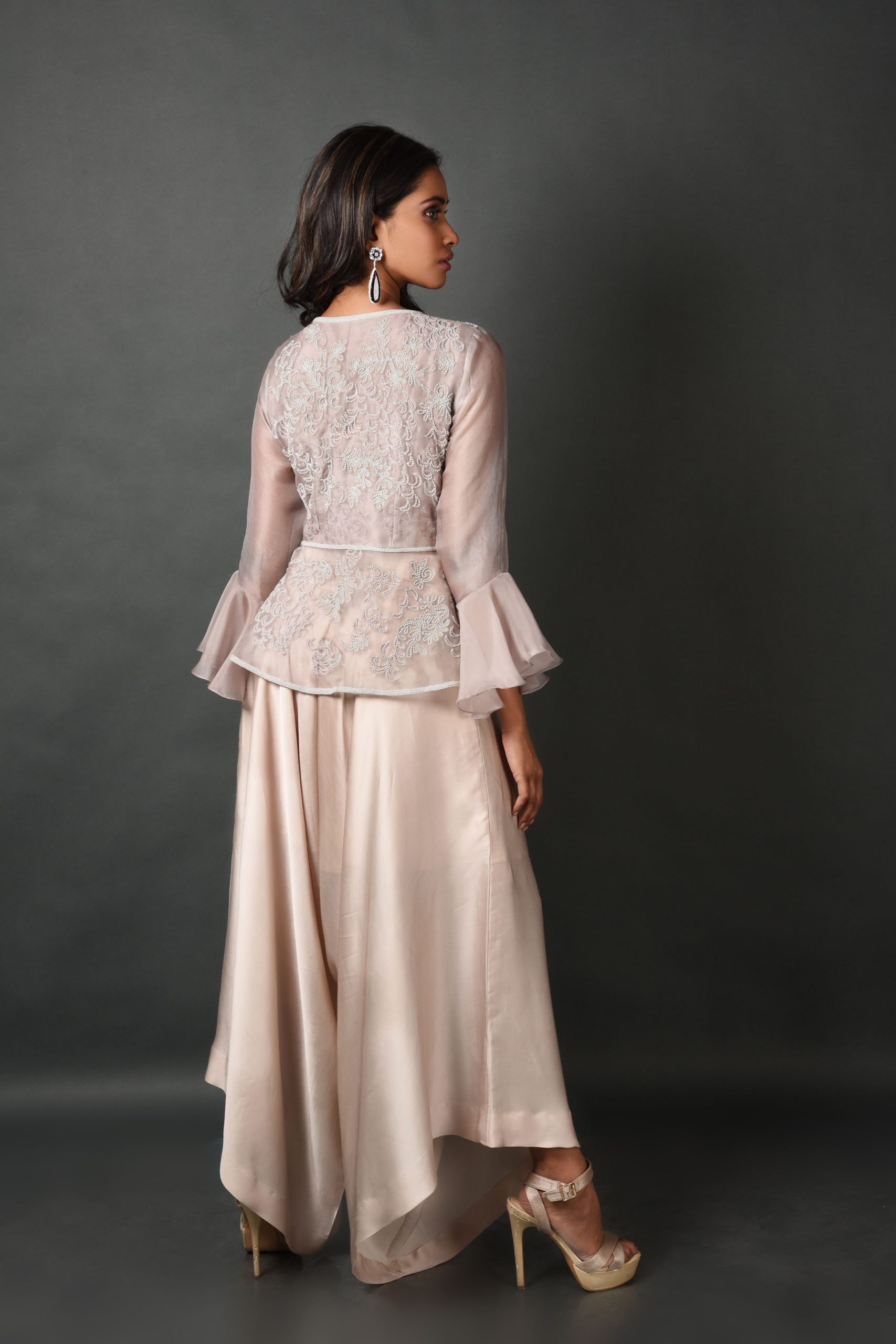 Embrace elegance with the Peacock Grace Peplum Satin Top by House of Ksara. Featuring exquisite thread and moti work on grey satin, this peplum top with 3/4 circular flounce sleeves is perfect for gatherings, cocktail parties, and milestone celebrations. Handcrafted to perfection, it combines traditional craftsmanship with modern sophistication.