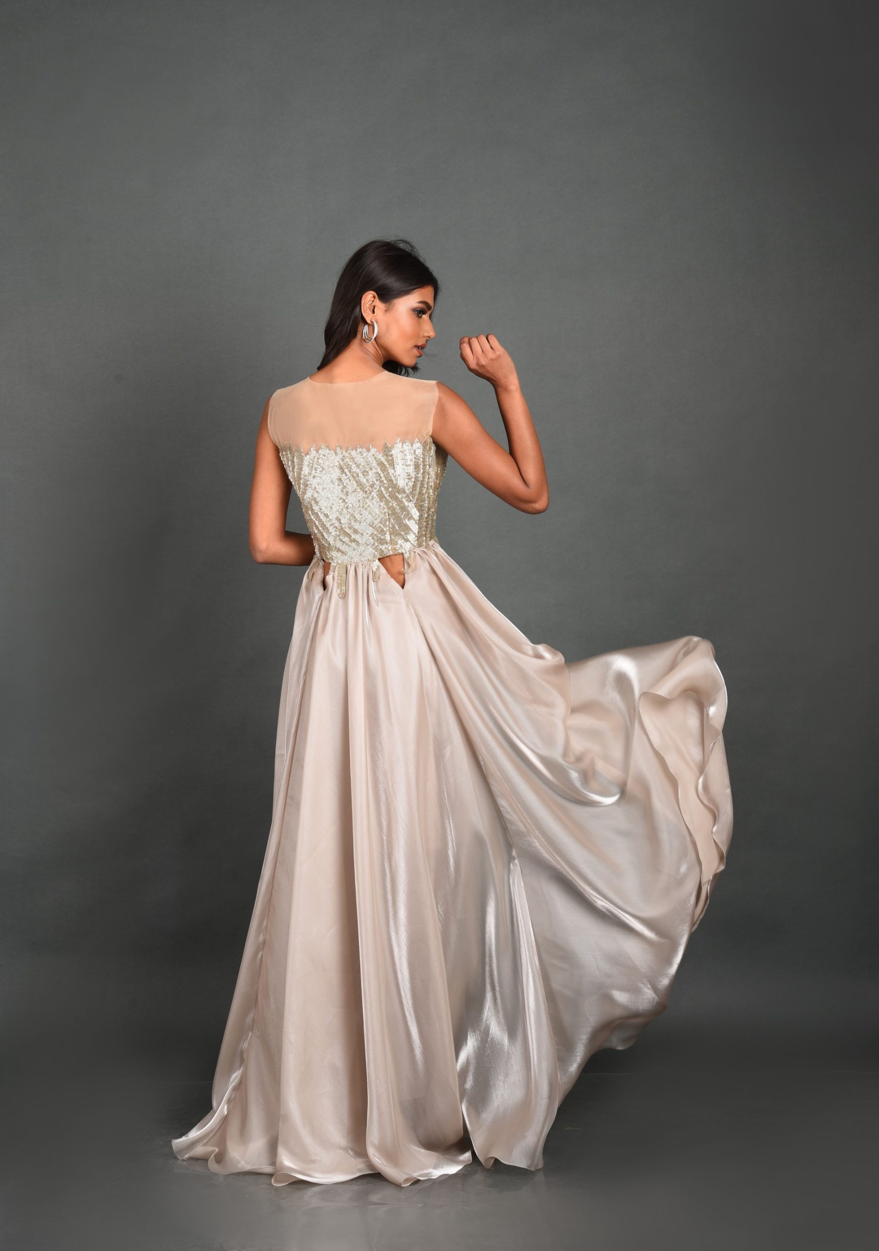 Shine brightly with the Jewel Radiance Bow Gown from House of kSara’s “Put a Bow on It” collection. Crafted from shimmer georgette, this sleeveless gown features a front drape with a back trail and playful bow accents. Adorned with Cutdana work, it’s perfect for milestone birthdays, anniversary parties, cocktail soirées, and engagement events. Embrace your Indian roots with a playful twist and let your style stand out!