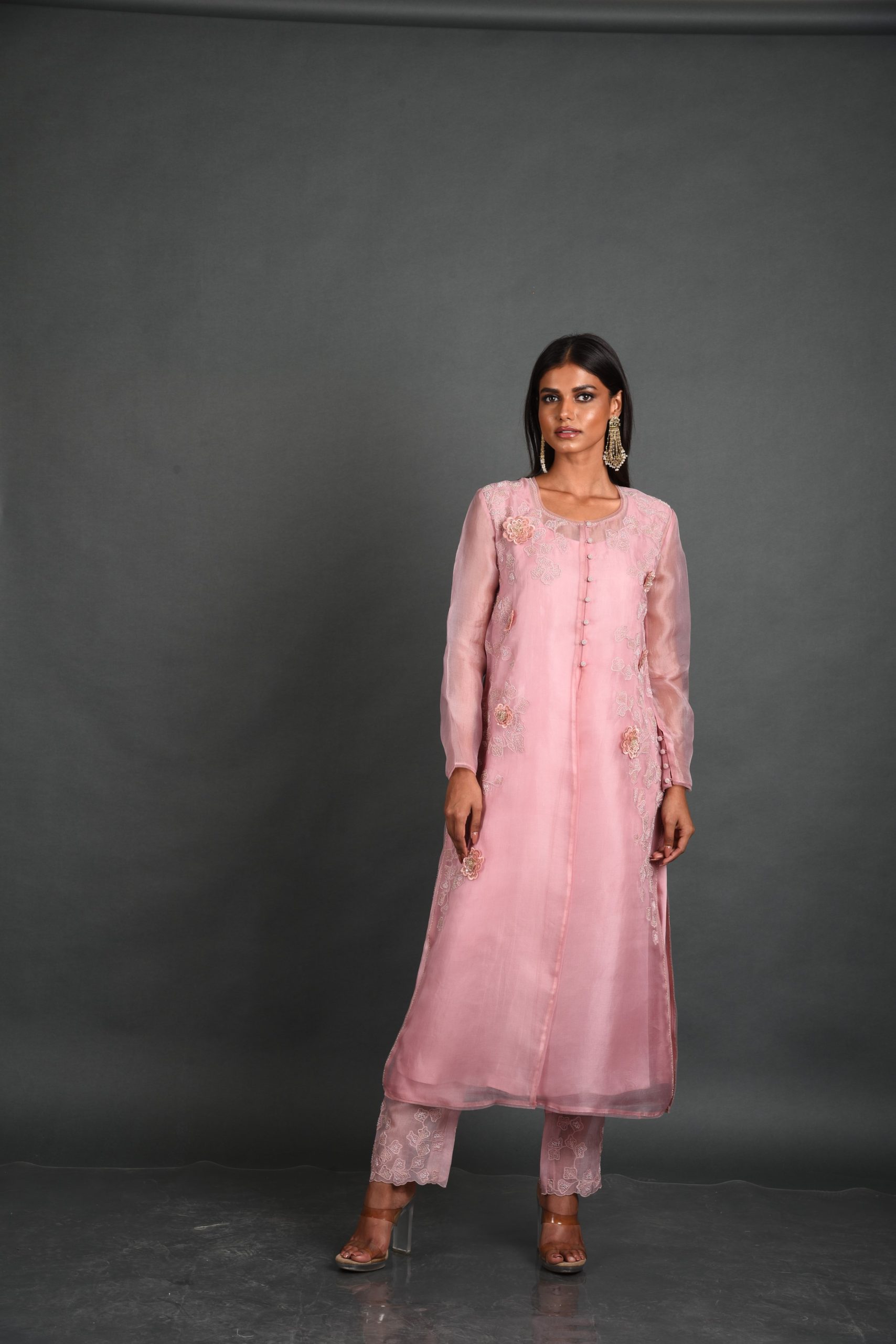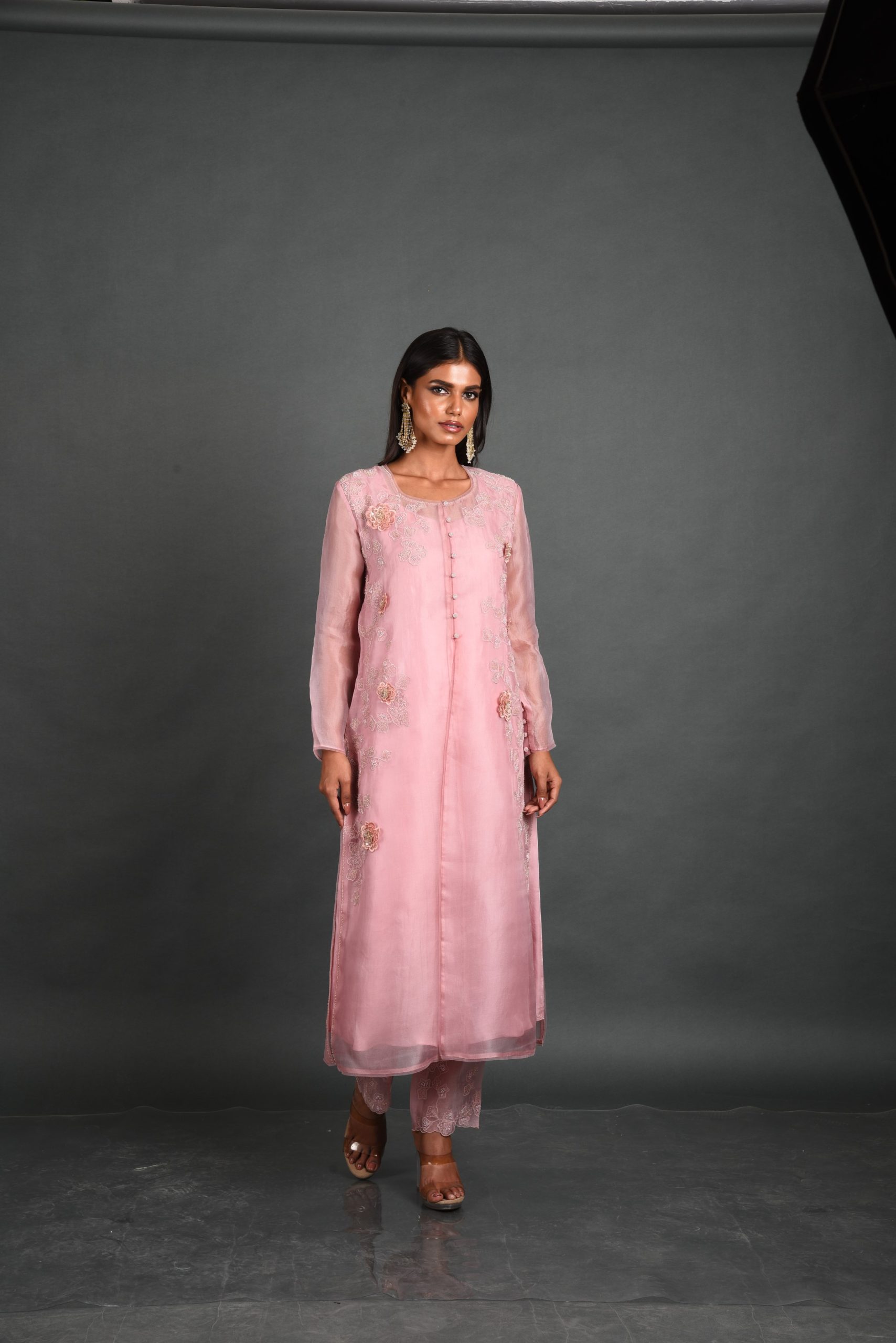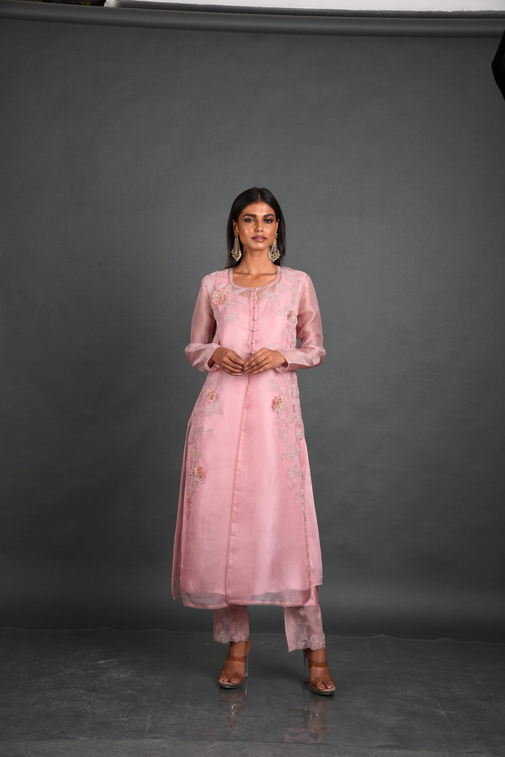 The flowing silhouette, complete with a round neckline and straight cuff sleeves, brings both comfort and style to the forefront, while the intricate thread and bead embroidery adds a touch of opulence to the design. Each floral motif is meticulously handcrafted by local artisans, with every bead carefully sewn to create a symphony of texture and elegance, reminiscent of a blooming garden. The soft pink hue captures the essence of a romantic sunset, blending beautifully with the shimmering organza fabric to evoke a sense of lightness and grace.