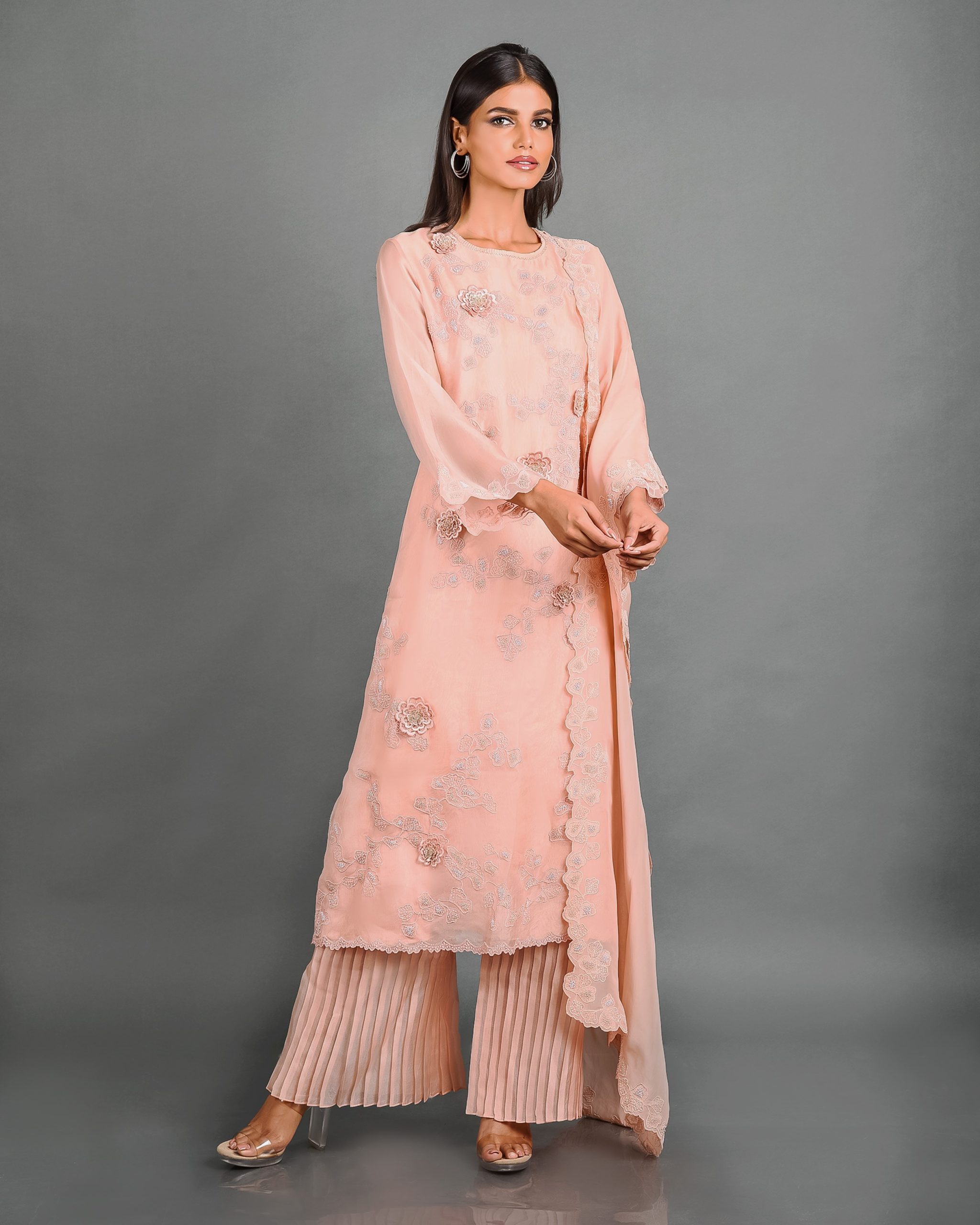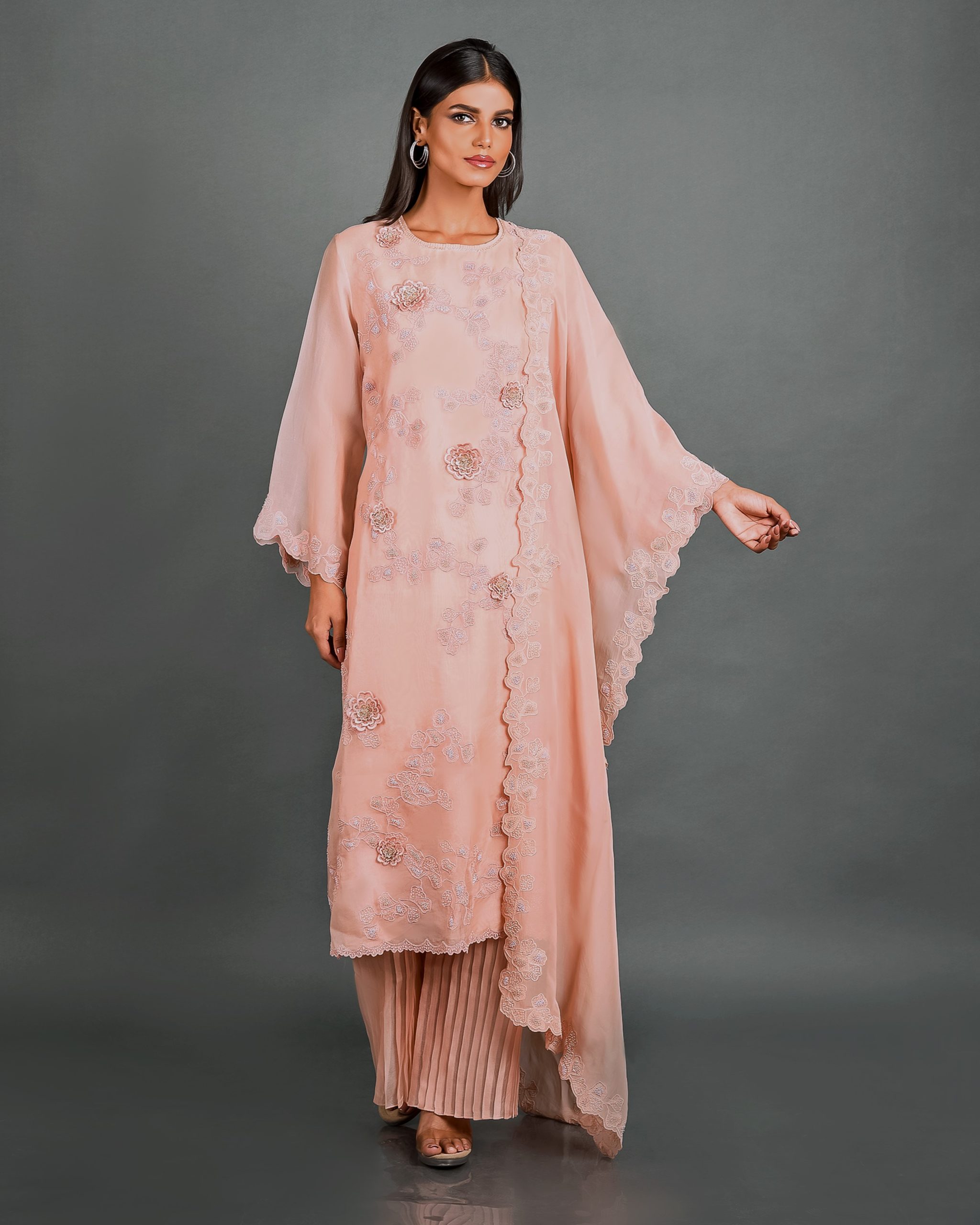 Discover timeless elegance with the Enchanting Peacock Motif A-Line Kurta from House of Ksara’s “Own Your Strut” collection. Crafted from pink organza with delicate thread bead work, this kurta embodies the grace and beauty of India’s national bird. Perfect for afternoon soirees and formal occasions, it combines traditional craftsmanship with modern sophistication, empowering you to own every moment with confidence.