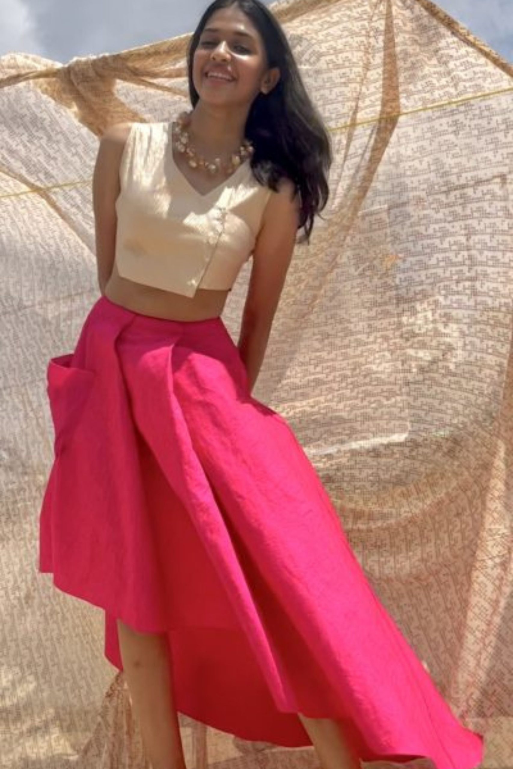 Discover elegance and playfulness with our Asymmetric Long Short Skirt – Pink Blossom from House of Ksara’s ‘Put a Bow on It’ collection. Handcrafted with care, this skirt features an asymmetric silhouette that adds a modern twist to traditional Indian charm. Perfect for afternoon soirées and cocktail parties, it effortlessly blends comfort with sophistication, ensuring you stand out at every occasion.