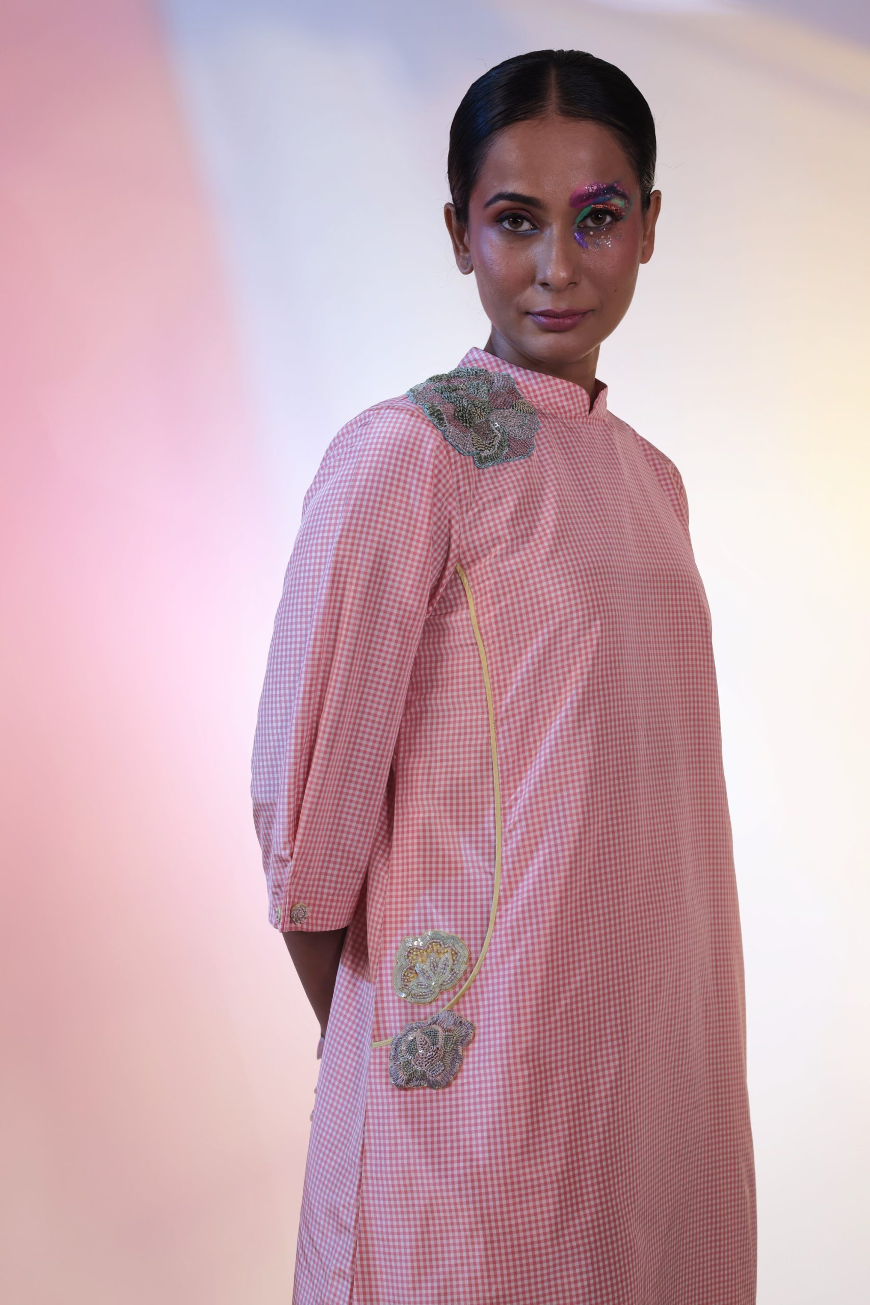 Embrace serene elegance with the Blossom Meadow Silk Dress from House of kSara’s “Meadow’s Song” collection. Crafted from luxurious woven silk in a delicate check pattern, this dress features underarm pockets, 3/4 pinched sleeves, and a mandarin collar. Intricate thread bead work and a soft pink color embody grace and subtlety, perfect for afternoon soirees, parties, and formal events. Meticulously handcrafted by skilled artisans, this dress captures the pure joy and effortless happiness of a sun-kissed meadow.