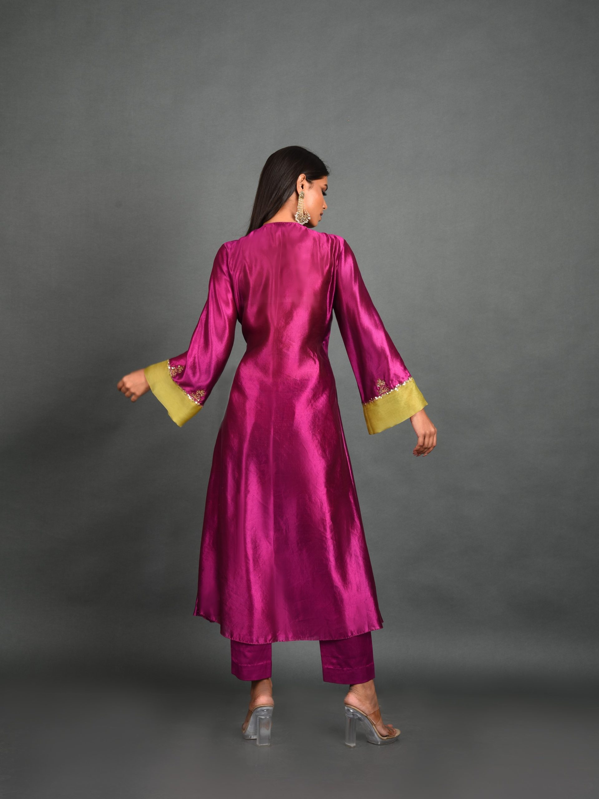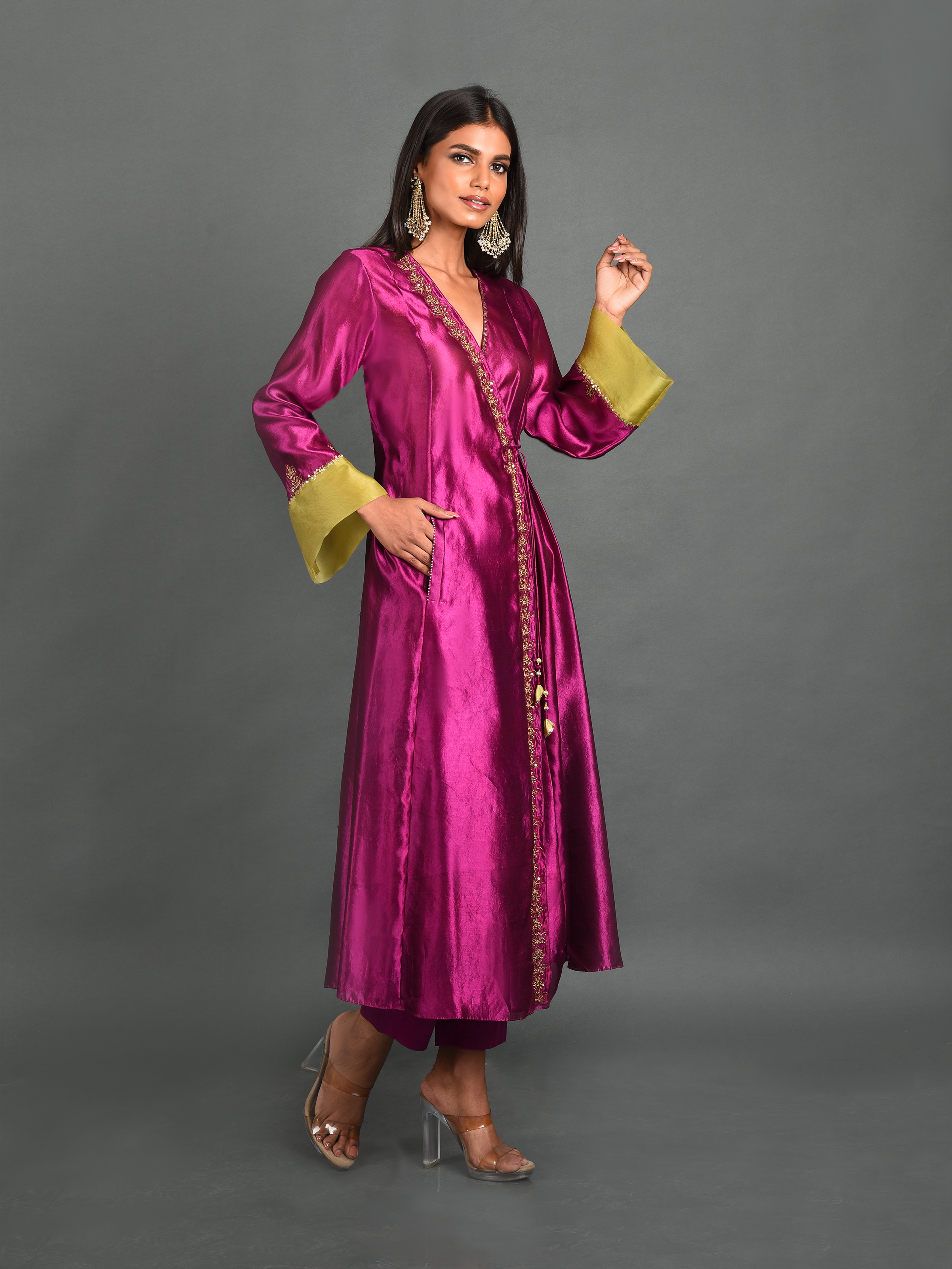 Embrace the ethereal beauty of dawn with the Radiant Sunrise Angrakha Kurta from House of kSara by Shradha Saraf. Crafted from luxurious Kora Dupion silk, this pink kurta features elegant Taramoti work, a V Overlap neck, and Bell sleeves, perfect for Haldi functions, engagement parties, and evening gatherings.
