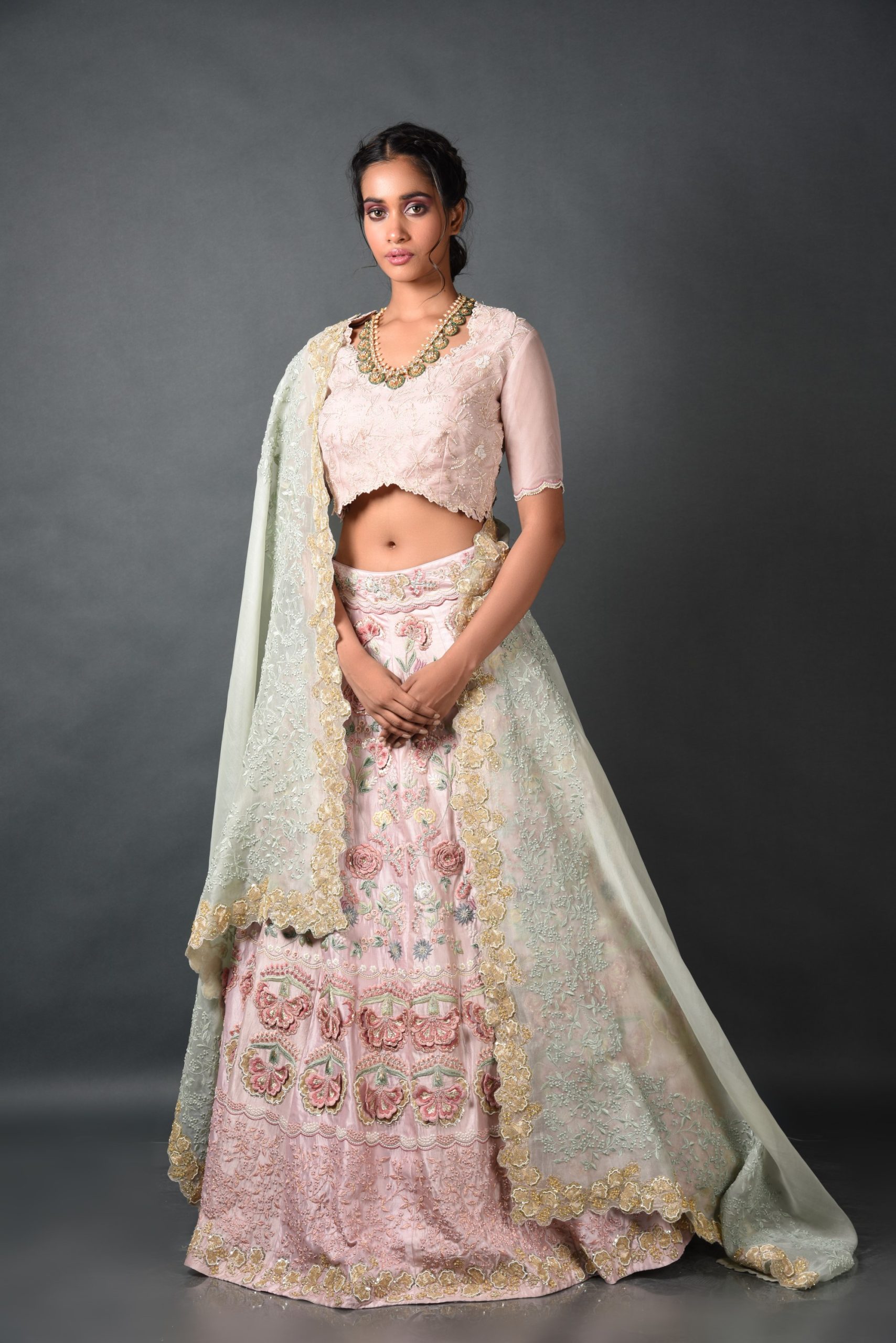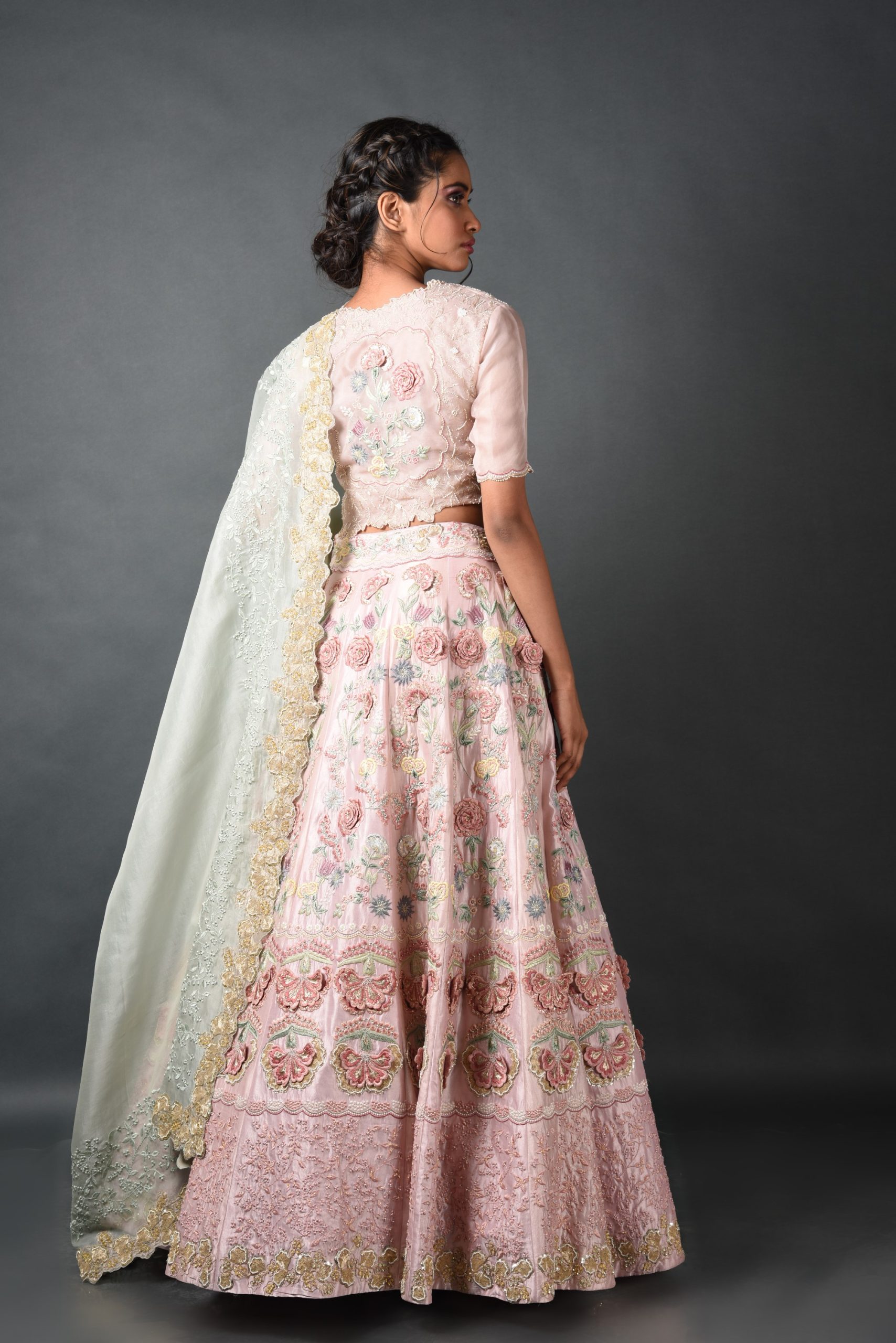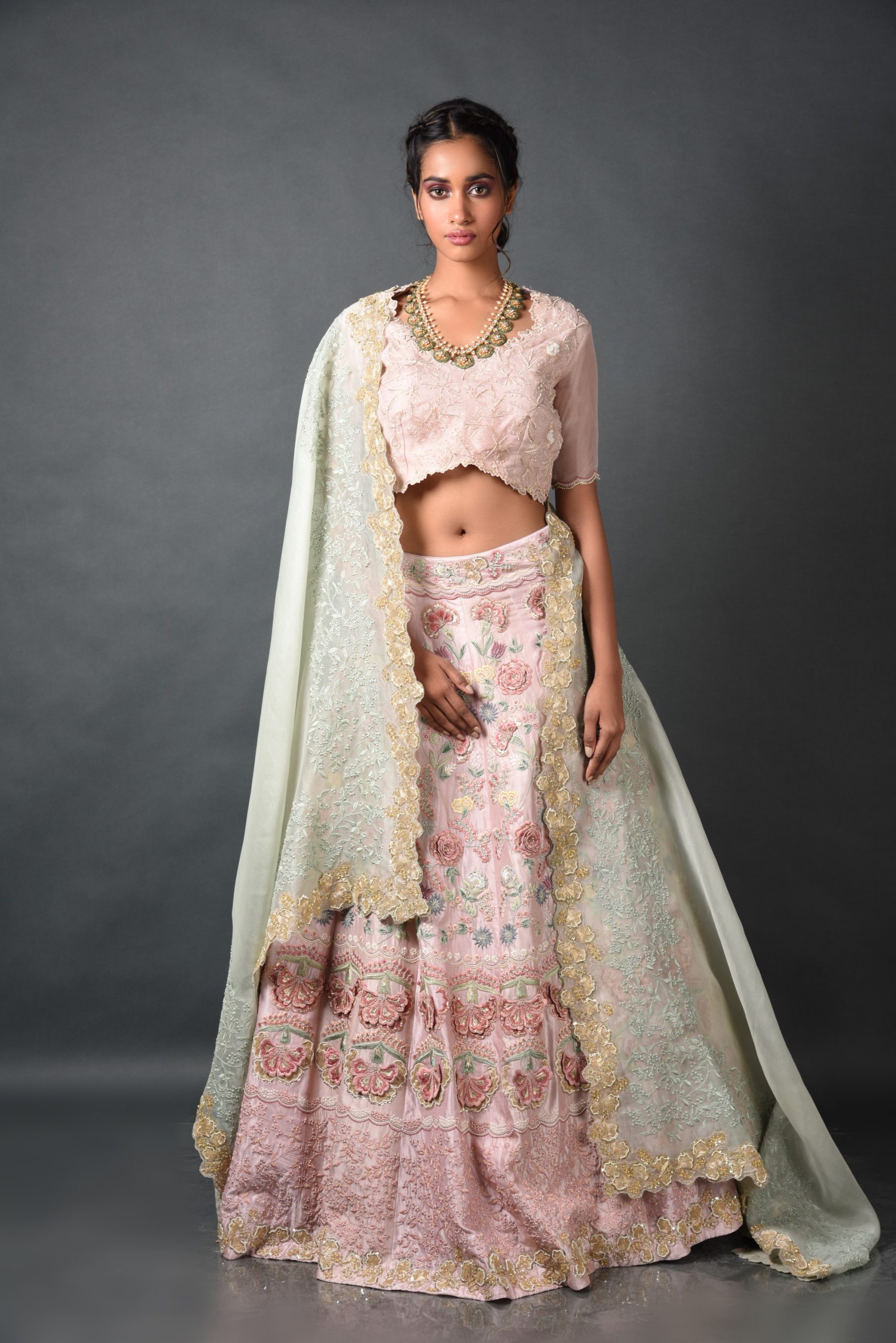 Experience the enchanting allure of nature with the Petal Pink Bloom Lehenga from House of kSara’s Bloom collection. Crafted from luxurious Summer Silk – Kora Dupion and adorned with intricate Zari, Dori, Moti, and Maal work, this Kalidar lehenga celebrates the beauty of blooming flowers. Perfect for weddings and receptions, it combines tradition with modern elegance, making you the epitome of timeless charm.