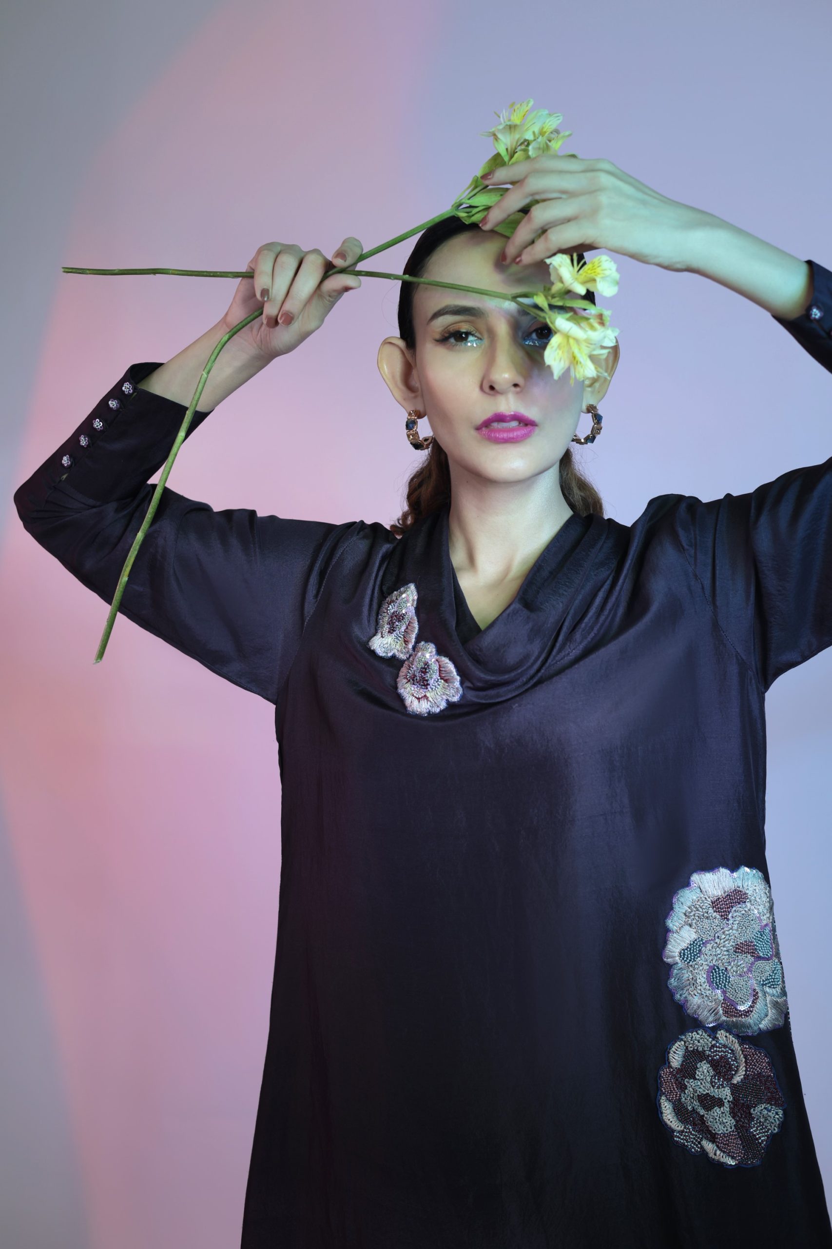 Embrace serene elegance with the Ethereal Meadow Cowl Kurta from House of kSara’s “Meadows Song” collection. This luxurious kurta, crafted from thick silk, features an A-line silhouette, cowl neck, and intricate thread bead work. The rich purple hue is perfect for formal dinners and special gatherings. This kurta is an embodiment of effortless happiness and timeless beauty.