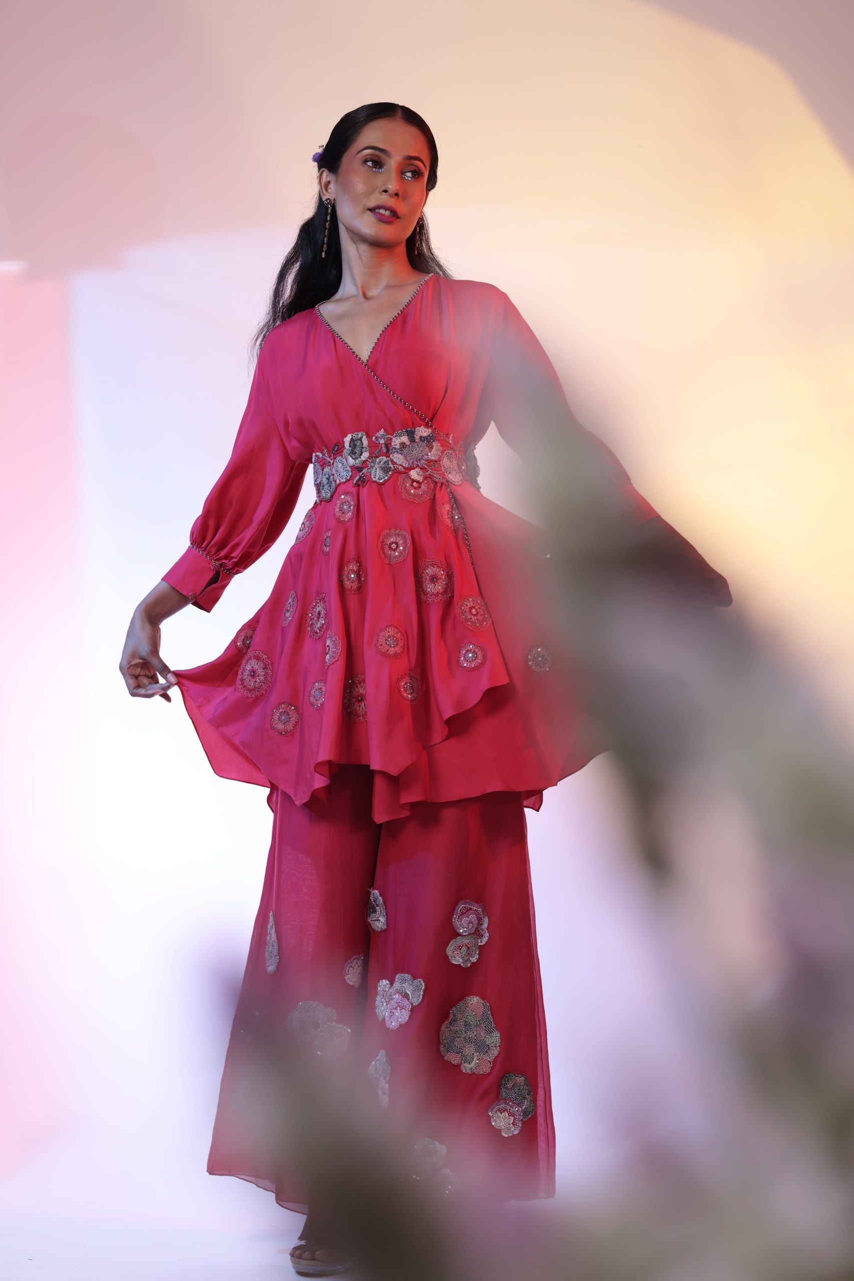 Elevate your wardrobe with the Ethereal Meadow V-Neck Satin Silk Top from House of Ksara. Featuring an Orep silhouette, overlap yoke cut, and intricate thread bead work, this luxurious red top is perfect for Mehendi parties, afternoon soirees, and formal events. Handcrafted for elegance, comfort, and sustainability, it offers a timeless blend of style and ease.