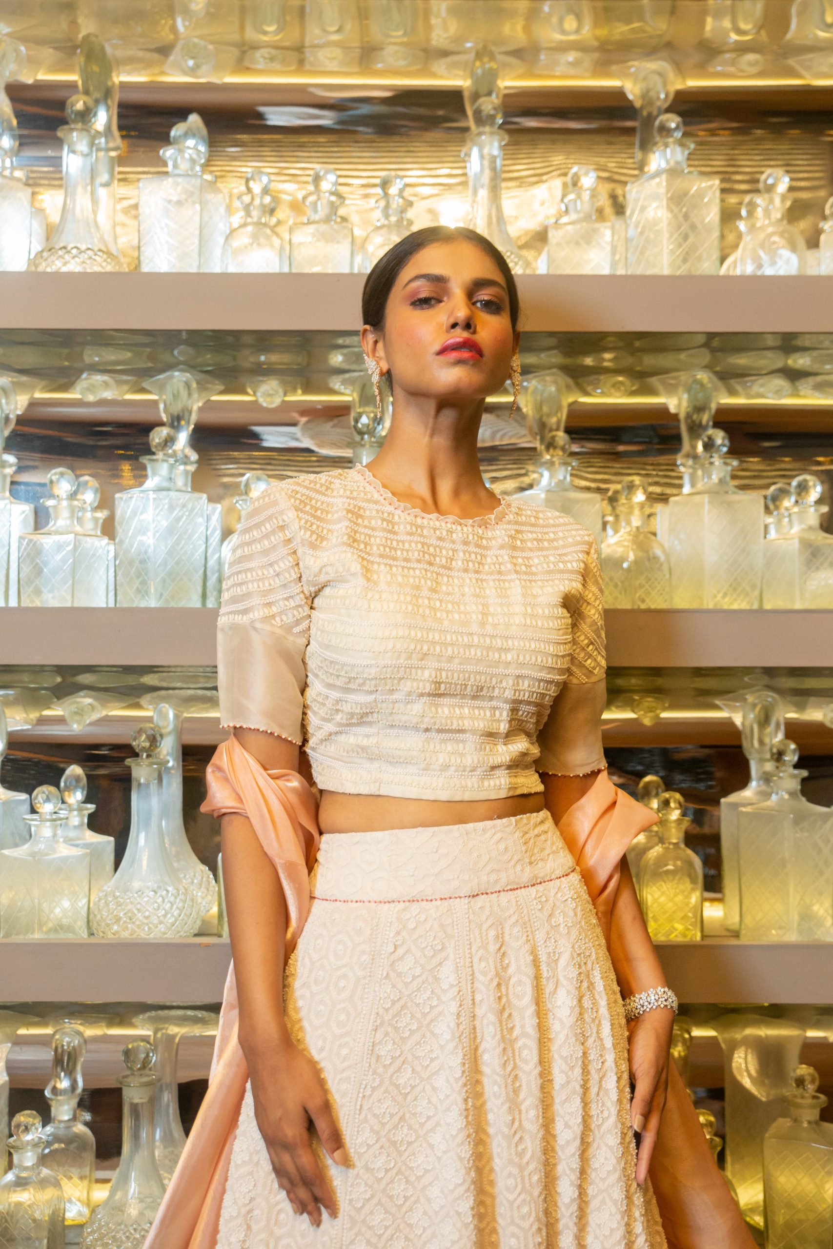 Experience the timeless beauty of the Ethereal Moonlight Chikankari Lehenga from House of Ksara’s “Khwaab” Collection. Handcrafted in Lucknow with intricate thread beadwork, this white Chikan fabric lehenga features an elegant umbrella silhouette, inspired by Mughal miniatures and moonlit gardens. Perfect for weddings and special occasions, it embodies the essence of Indian heritage and artisanal mastery.