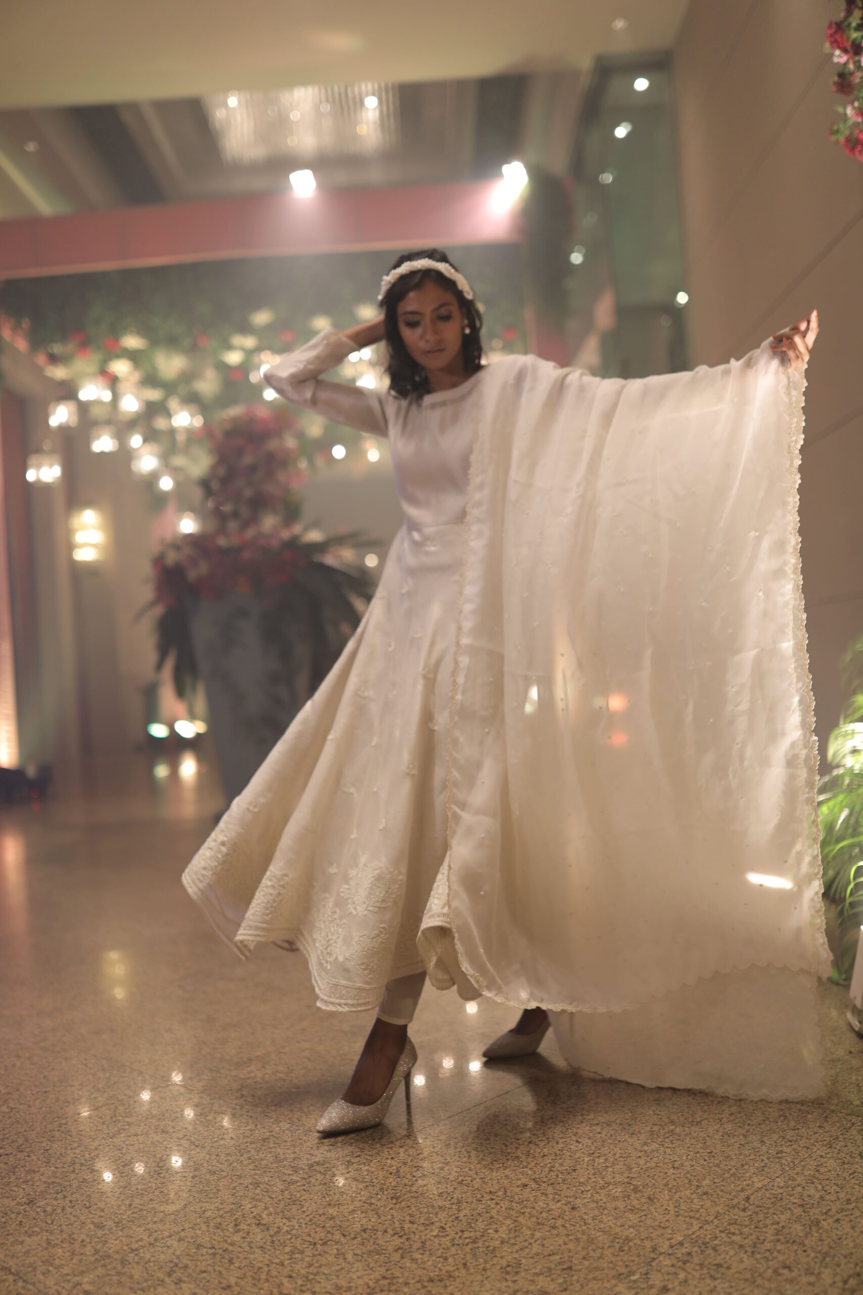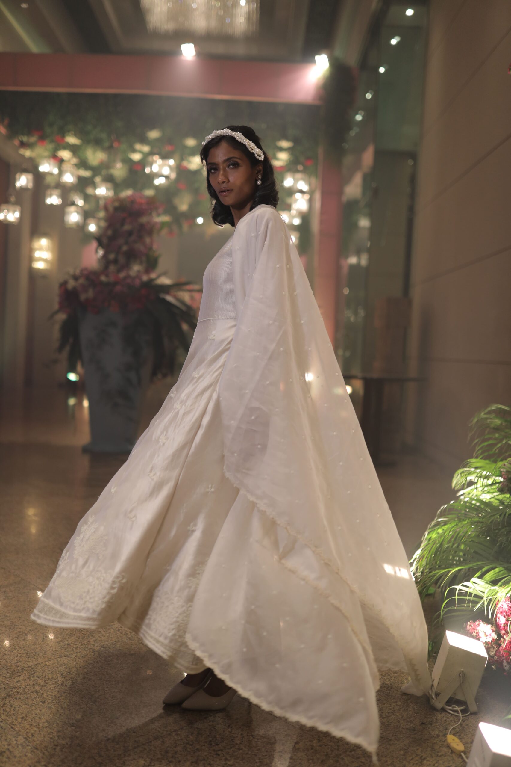 Introducing the White Radiance Umbrella Yoke Cut Kurta from House of Ksara by Shradha Saraf. Crafted from luxurious Summer Silk – Kora Dupion, this kurta features a stunning umbrella silhouette with a yoke cut, adorned with intricate Moti work. Perfect for cocktail parties and dinners, it combines traditional elegance with modern sophistication, empowering you with grace and confidence.