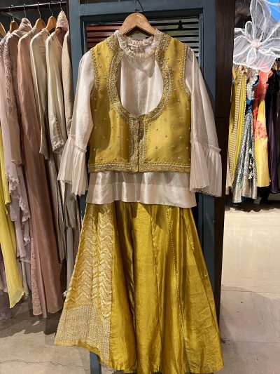 Discover elegance and sustainability with our Green Brocade Panel Pants from the ‘Woven Vogue’ collection by House of Ksara. Crafted with intricate thread bead work on luxurious brocade fabric, these pants are designed for comfort and style at sangeet events, engagements, and milestone celebrations. Embrace the heritage of Banarasi craftsmanship with every wear, ensuring timeless elegance for the modern woman.